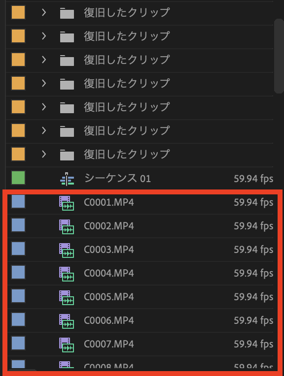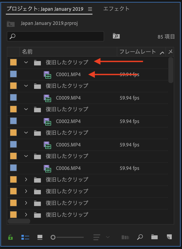 ただ読み込みは完璧とは言えず、プロジェクトウィンドウには「復旧したクリップ」のフォルダがずらりと並び、フォルダ一つ一つにクリップが入っている状況に。また面白いことにプロジェクトウィンドウをスクロールしていくと、全く同じクリップが一覧で表示されていました。