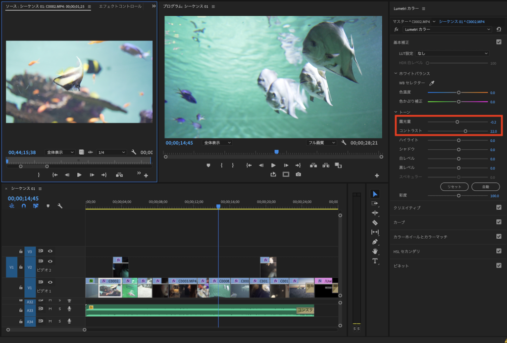 Rushで使用した色補正はPremiere ProではLumetriカラーとして継承されています。