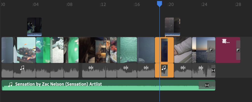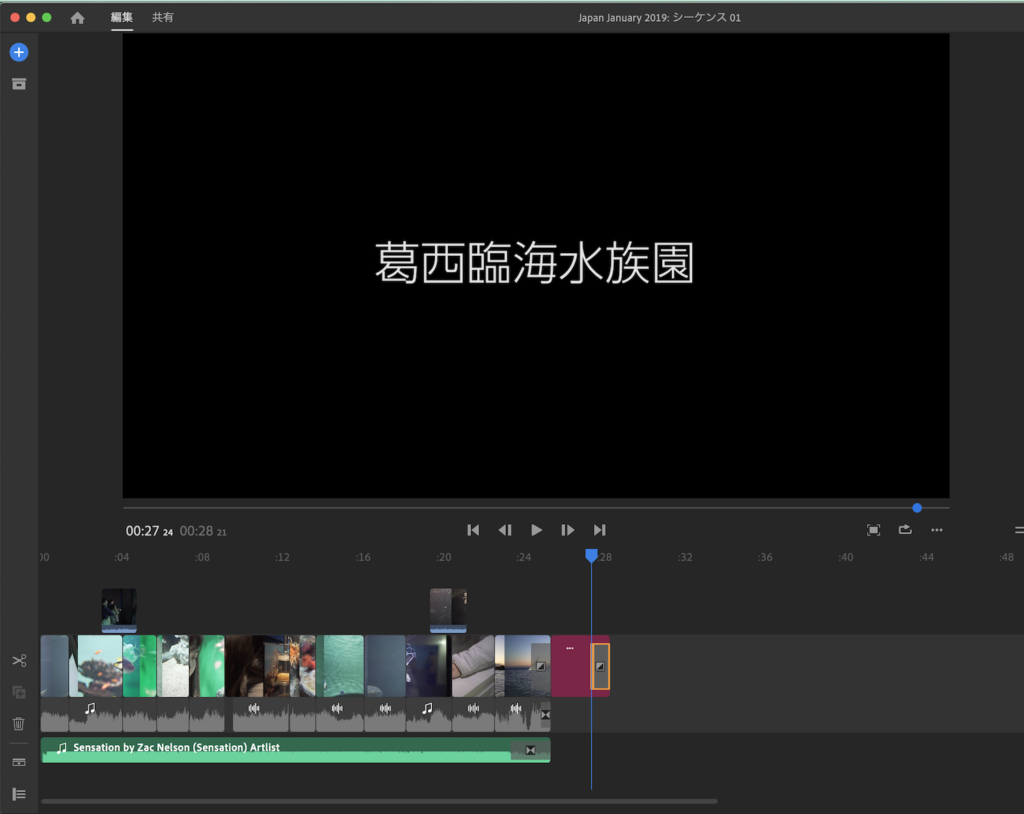 今回のチュートリアルで使用する編集したプロジェクトはこちら。約30秒程度の映像になりますが、Premiere Rushで使用できる機能はほとんど使用しています。
