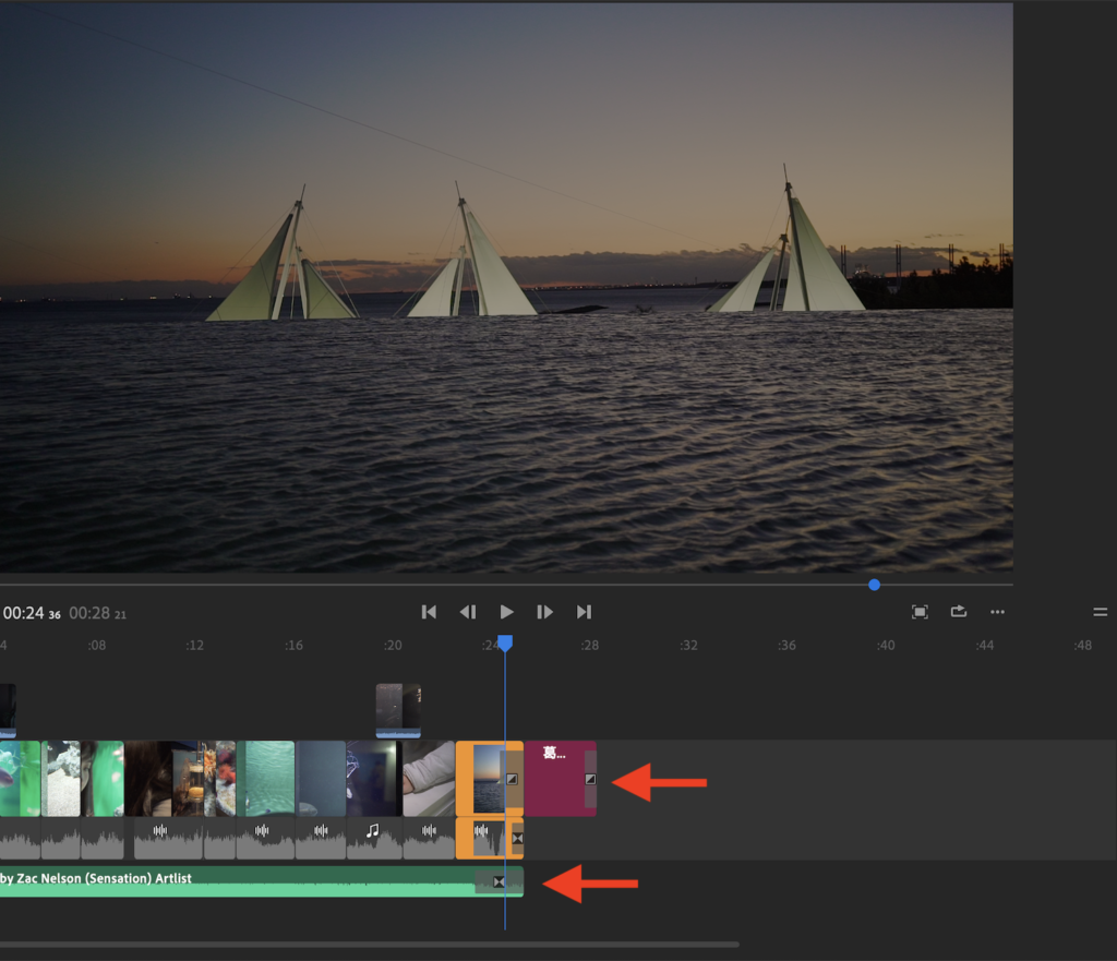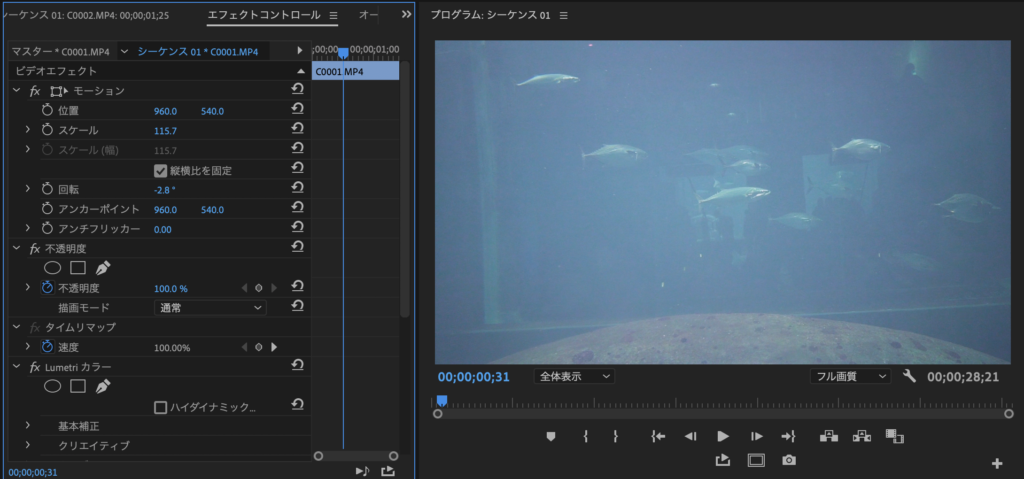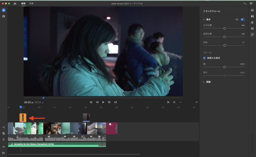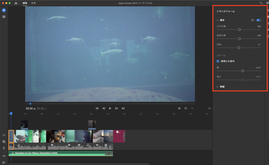 一部クリップには回転やスケールといったモーションのプロパティも適用させています。