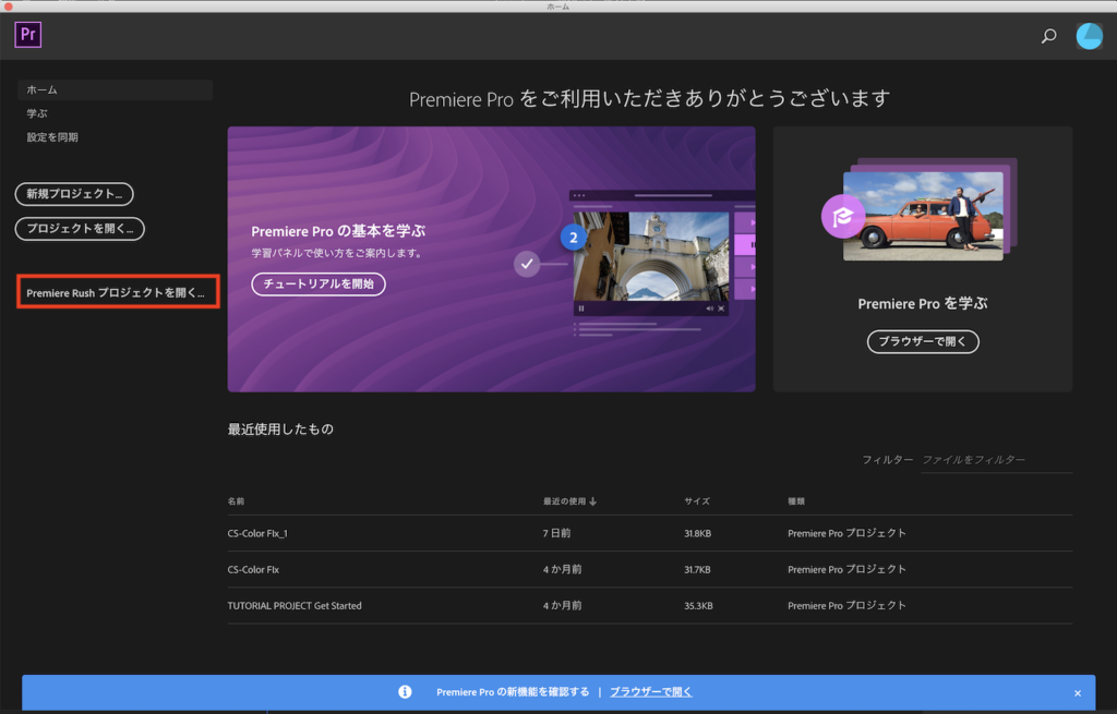 Premiere Proを開くとホーム画面が現れるので、左上にある「Premiere Rushプロジェクトを開く..」をクリックします。