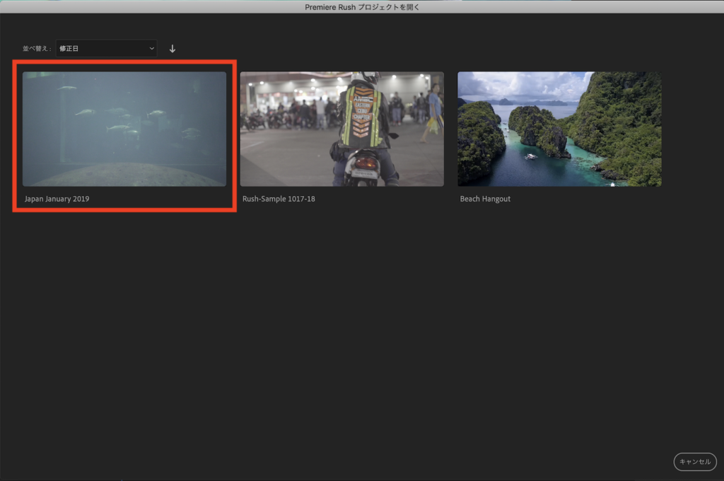 するとPremiere Rushでも見慣れているプロジェクト選択画面が現れるので、読み込みたいプロジェクトを選択しましょう。