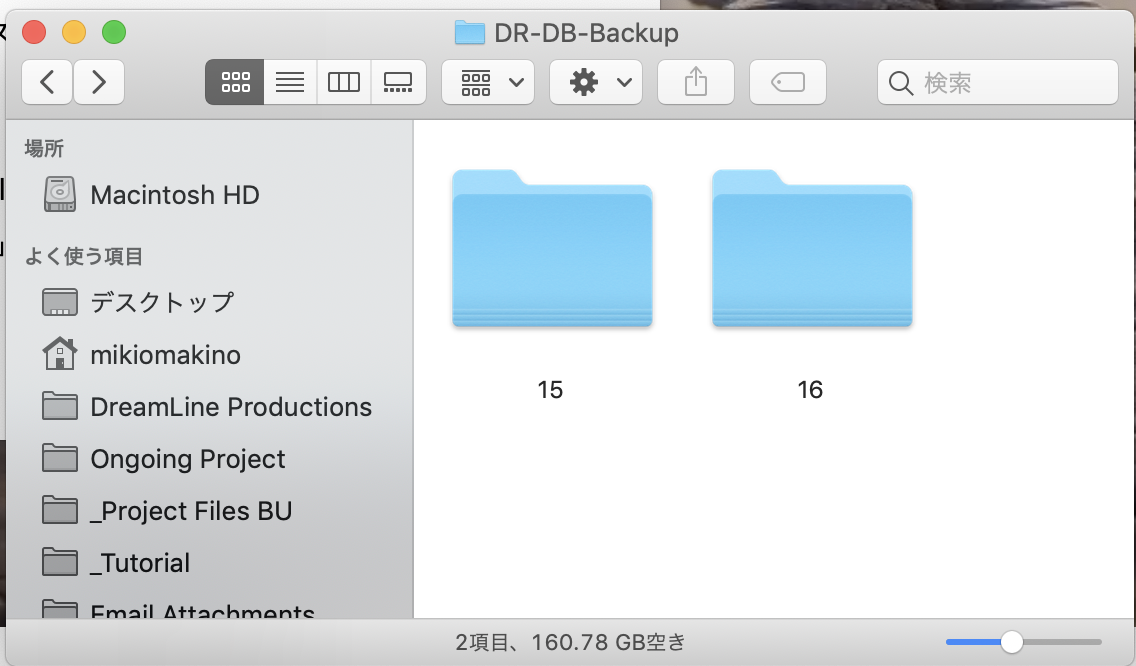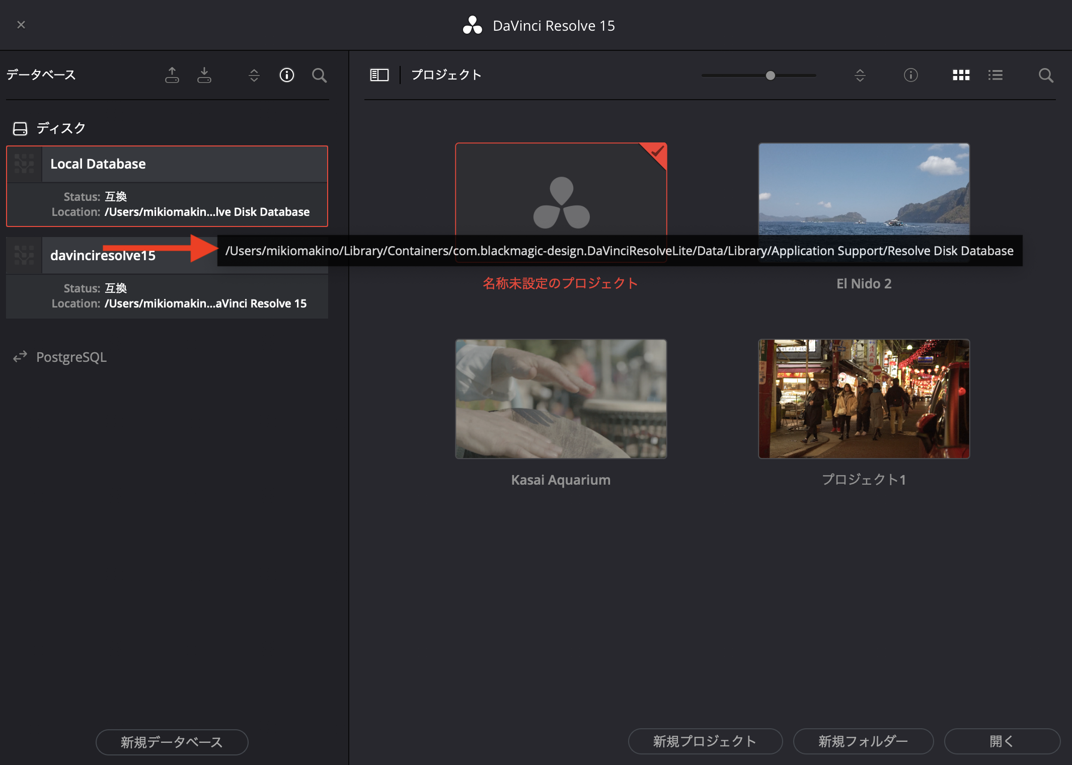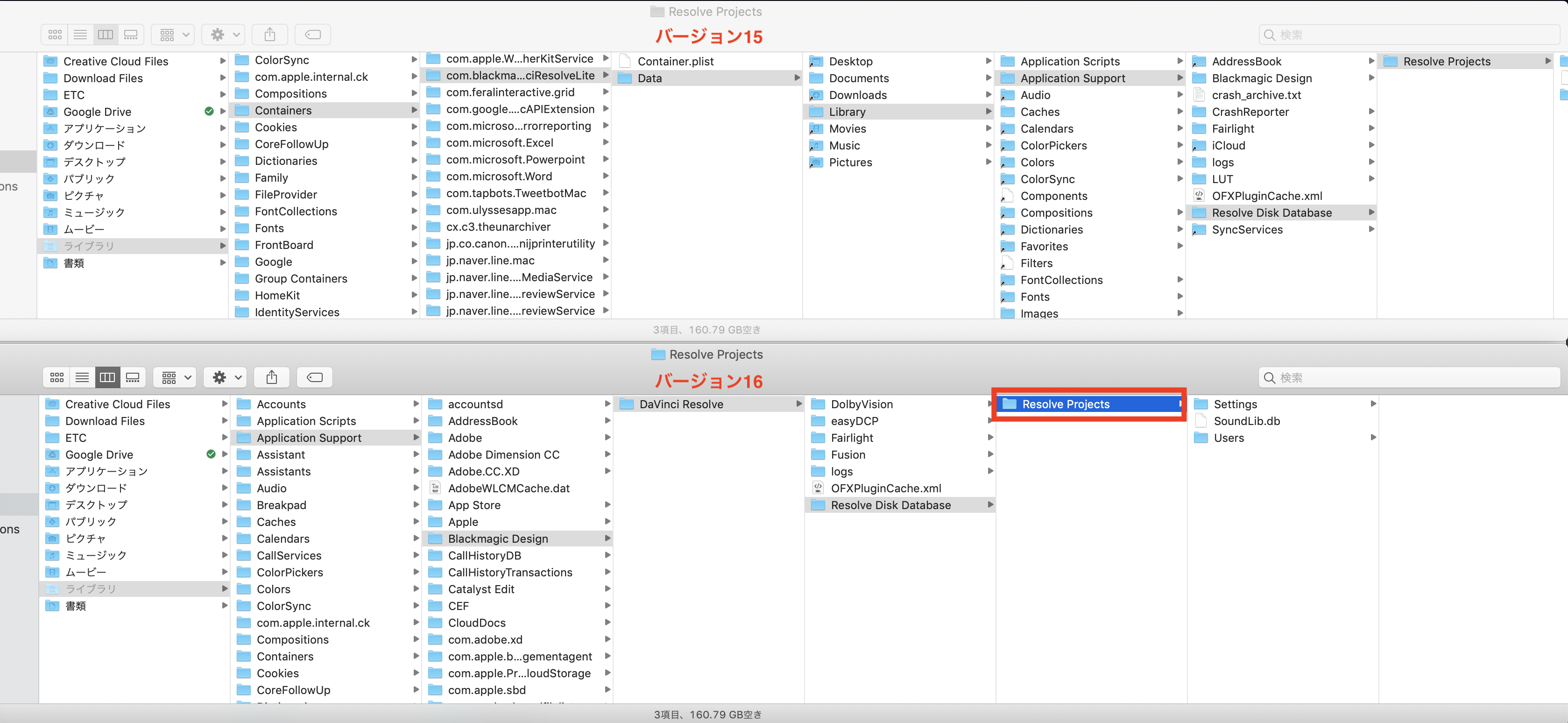 バージョン15のデータベースの保存先を確認してみると「User/ユーザー名/Library/Containers/com.blackmagicdesign.DaVinciResolveLite/Data/Application Support/Resolve Disk Database」になっています。