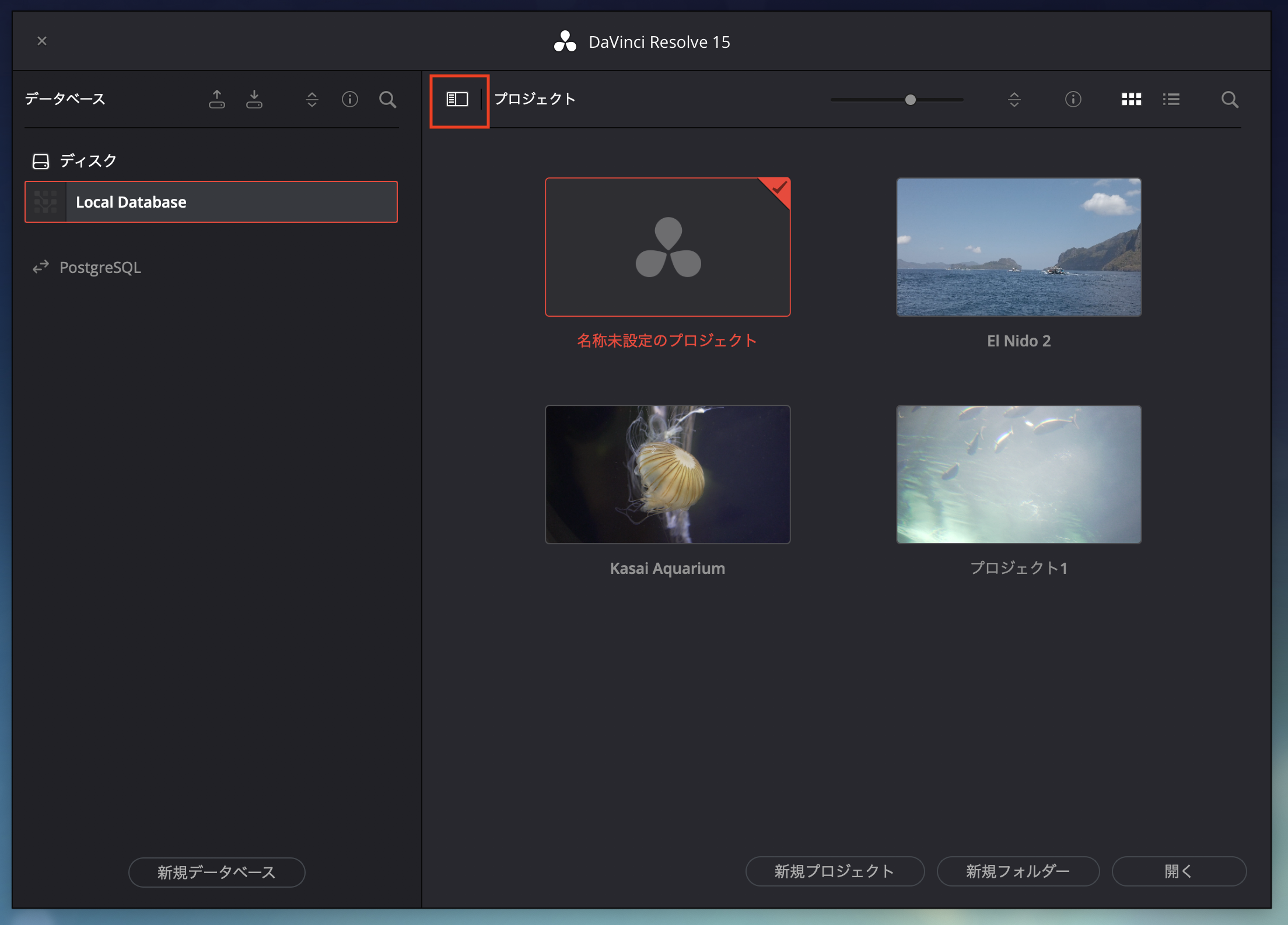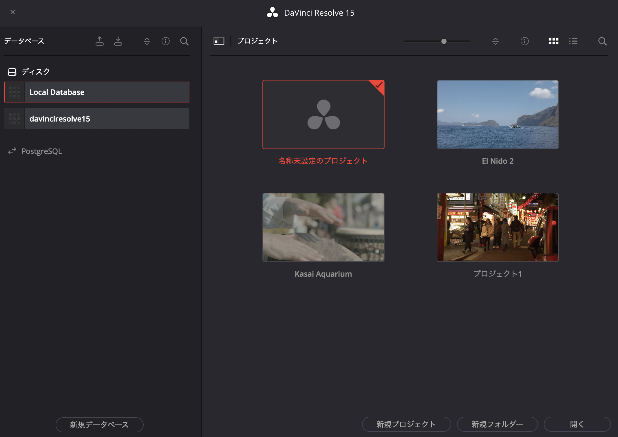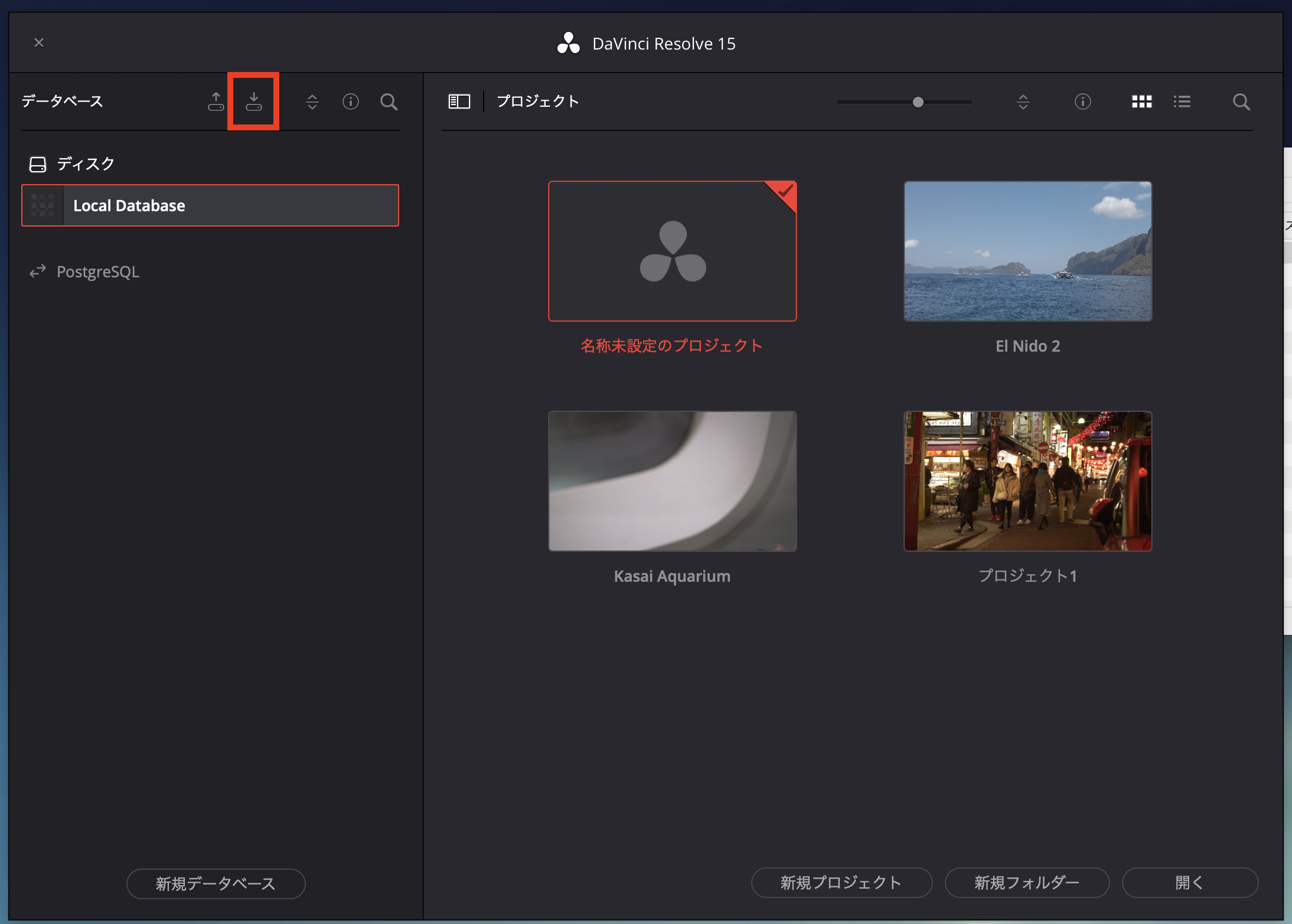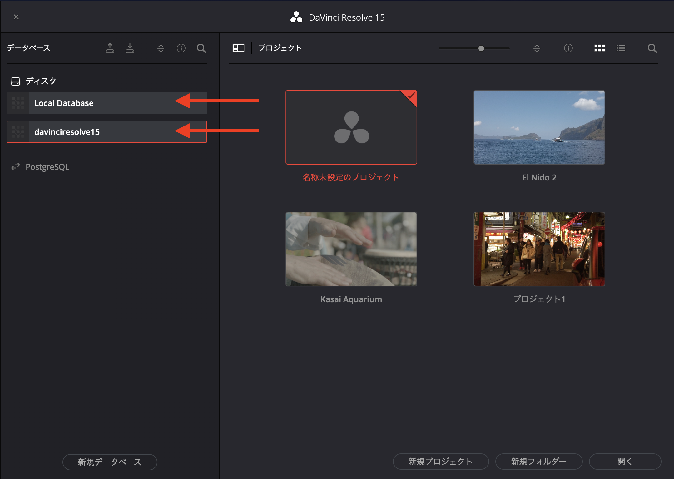 引き続きバージョン15でデータベースのを使用したい場合は、DaVinci Resolve 15の画面で先程複製した「davinciresolve15」のデータベースを選ぶと良いでしょう。
