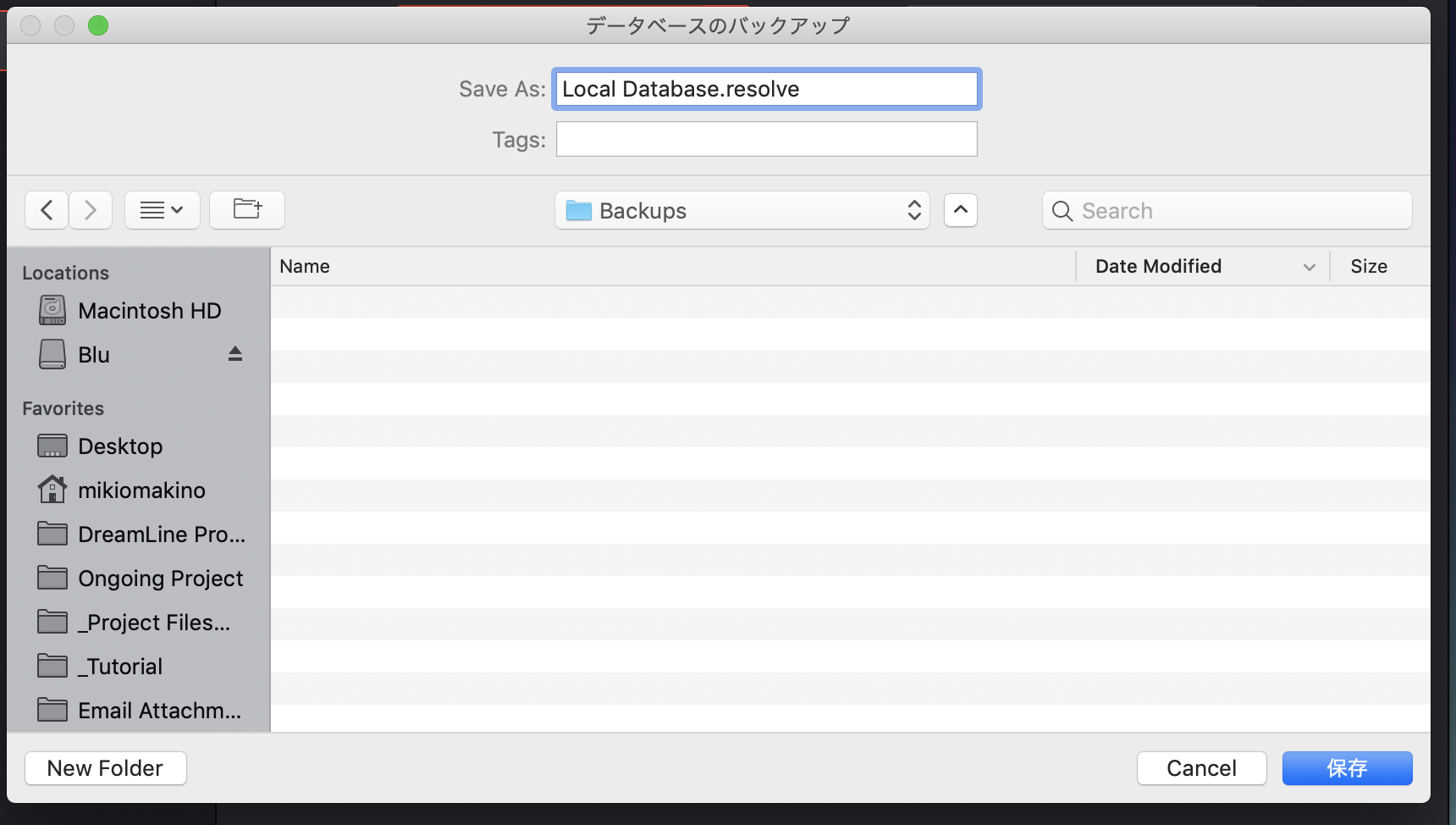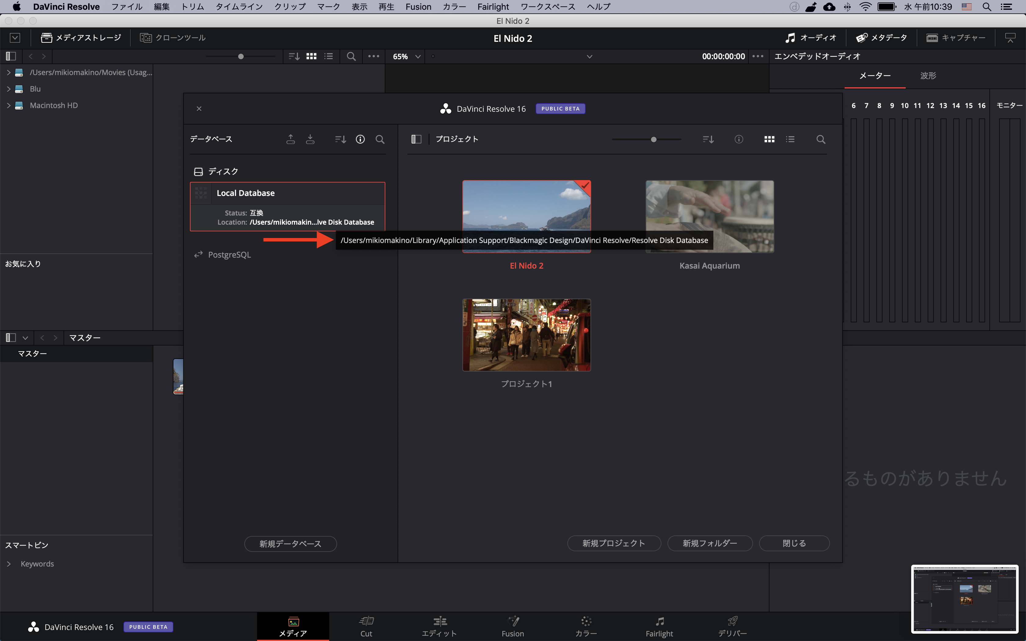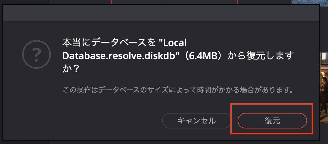 先程作成したデータベースのバックアップ(.diskdb)をDaVinci Resolve 16に読み込むのも良いのですが、それだと新しいデータベースが作成されてしまいます。