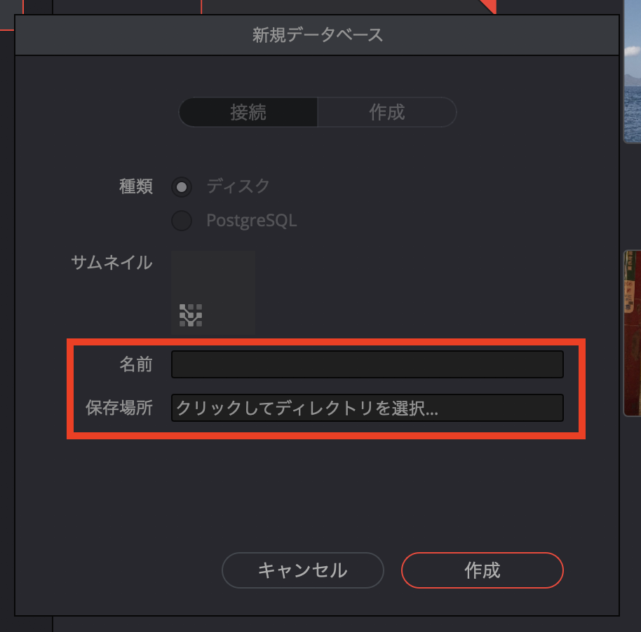 「名前」を入力し、「保存場所」ではデータベースの保存先を指定します。