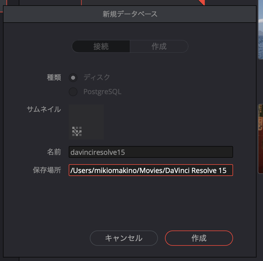 筆者の場合はバージョン15だとわかるように名前を「davinciresolve15」に、保存先は「ユーザー/ムービー/DaVinci Resolve 15」にしました。その後は「作成」をクリック。
