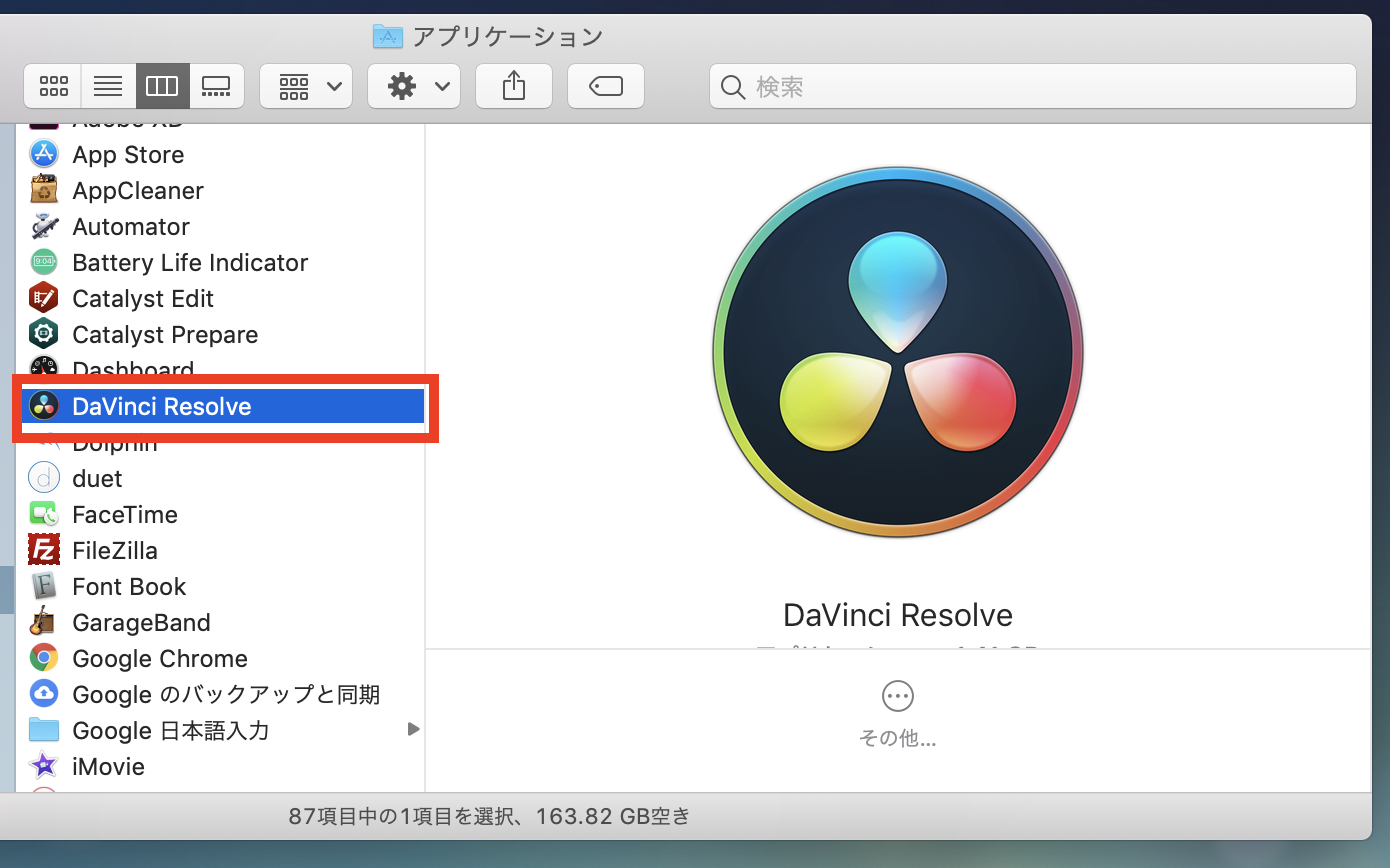 アプリケーションフォルダーを確認すると、無事にDaVinci Resolveが2バージョンインストールできているのがわかります。