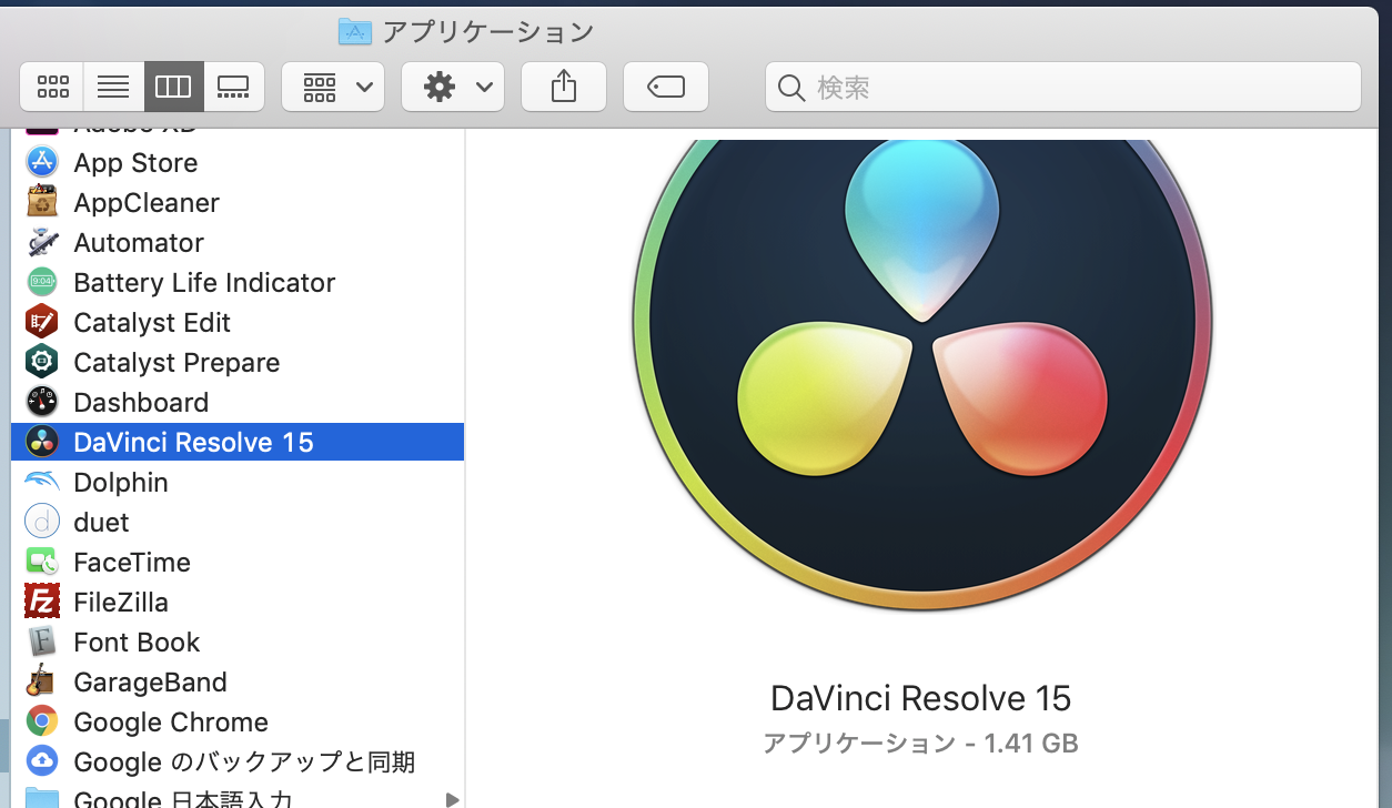 新バージョンのDaVinci Resolveをインストールする際、アプリケーションが上書きされてしまうので、それを防ぐためにアプリケーションフォルダー内にある「DaVinci Resolve」の名前を「DaVinci Resolve 15」に変更します。