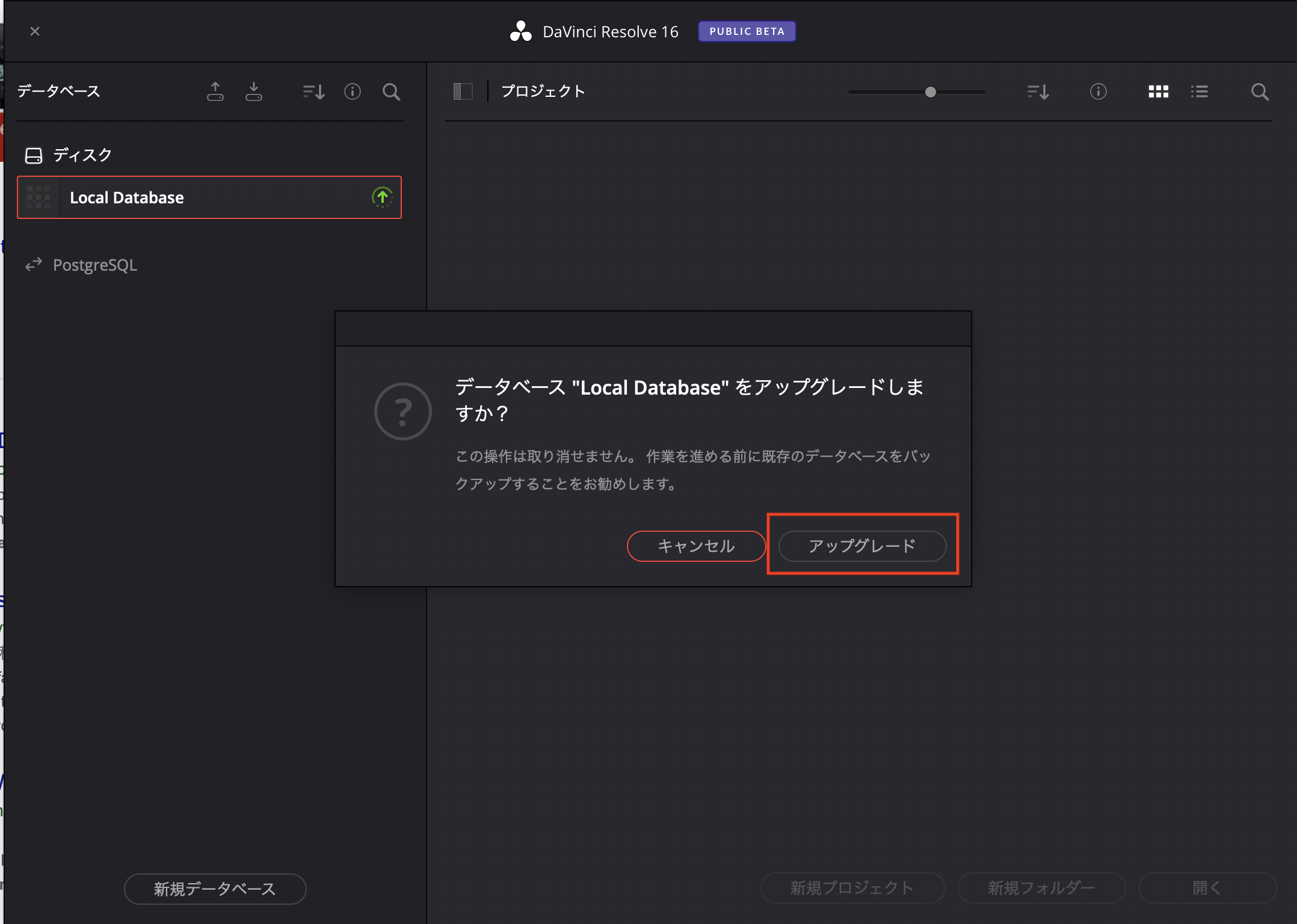 DaVinci Resolve 16を開くとプロジェクトマネージャーのウィンドウで「Local Databaseをアップデートしますか?」と表示されるので「アップデート」をクリックします。