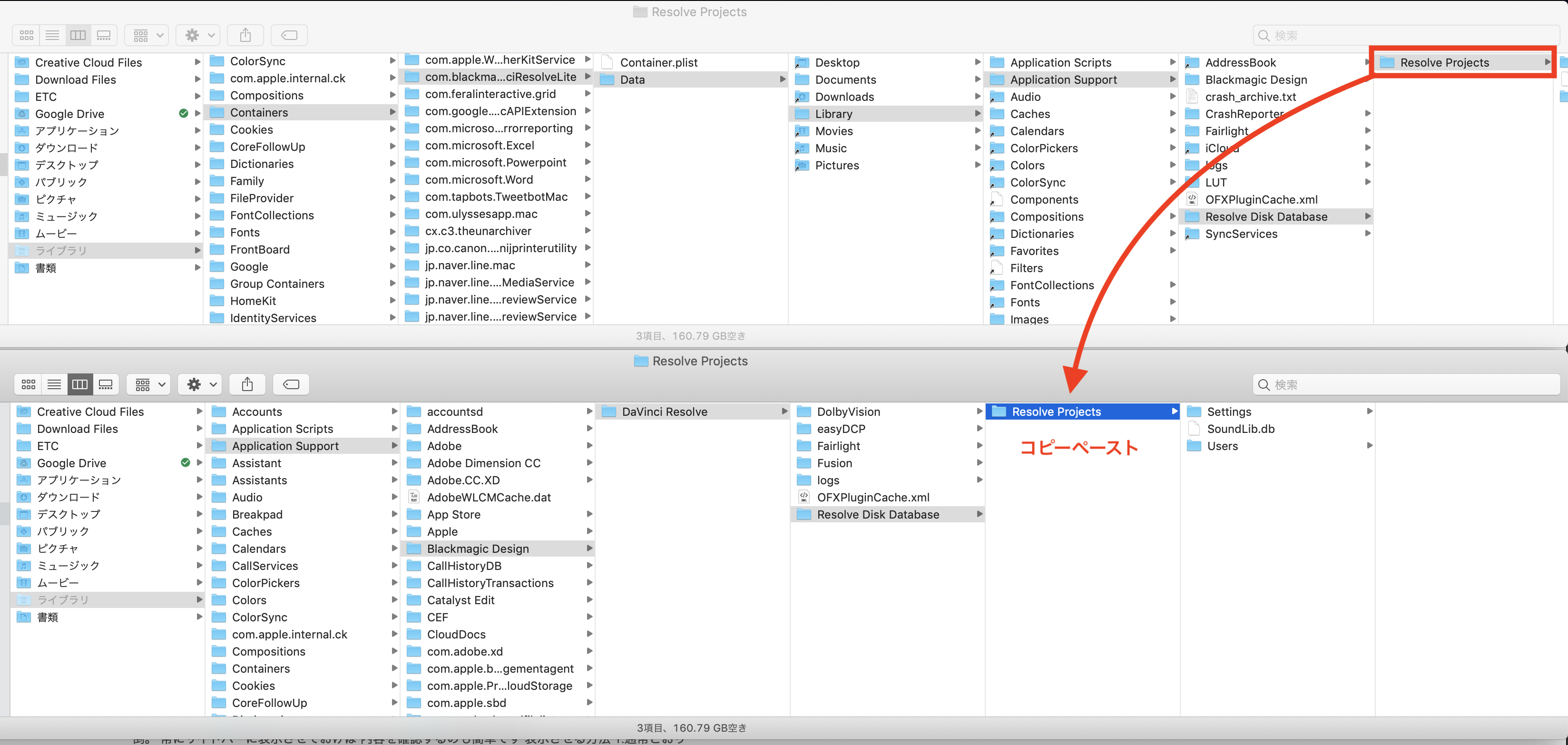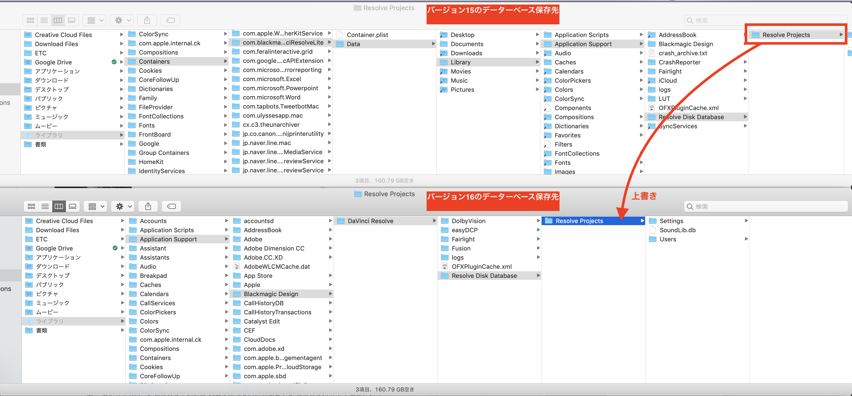 その後でバージョン15の「Resolve Projects」をコピーし、バージョン16の「Resolve Disk Database」内にペーストします。