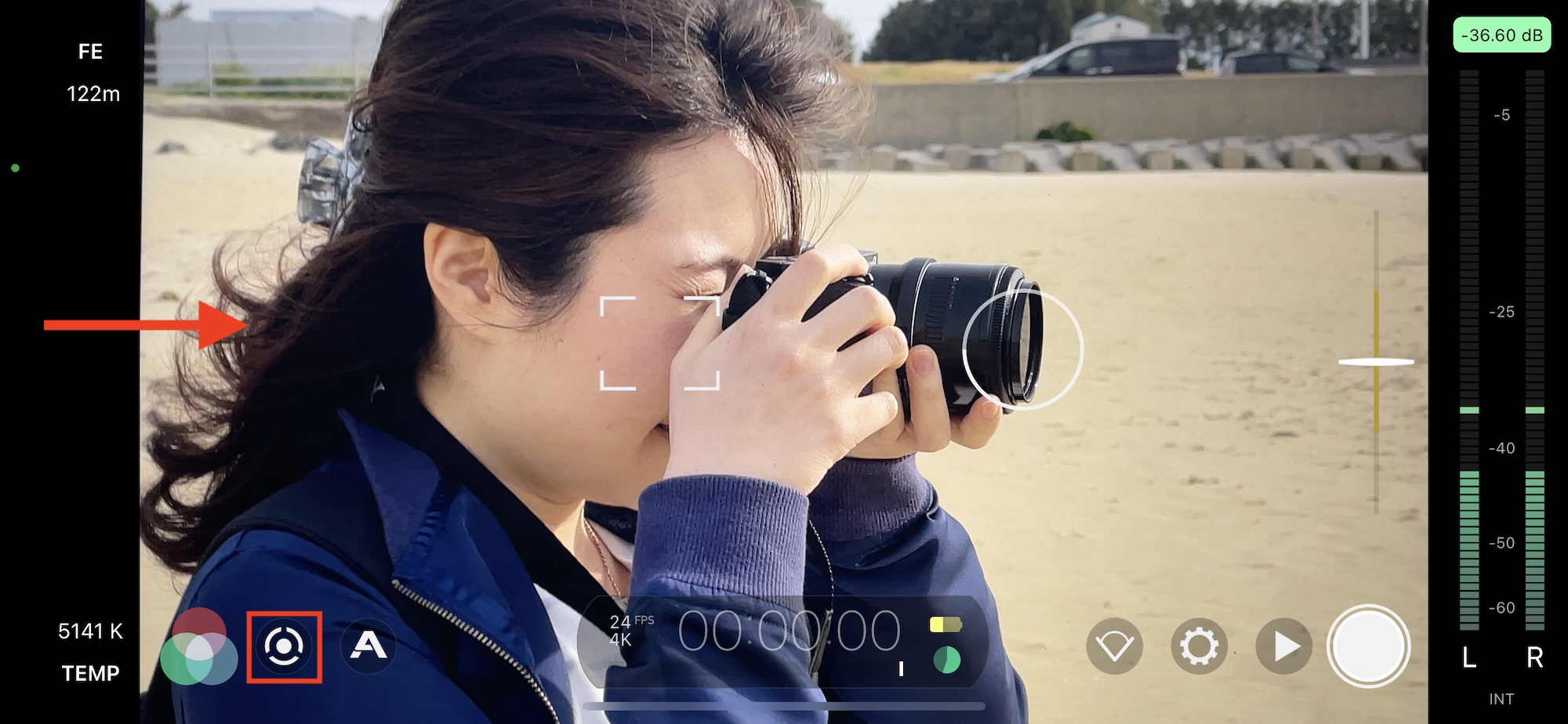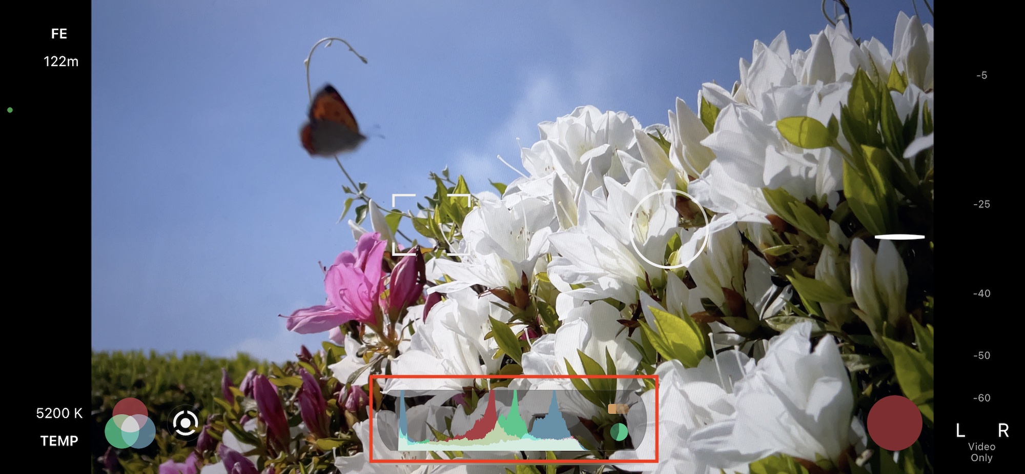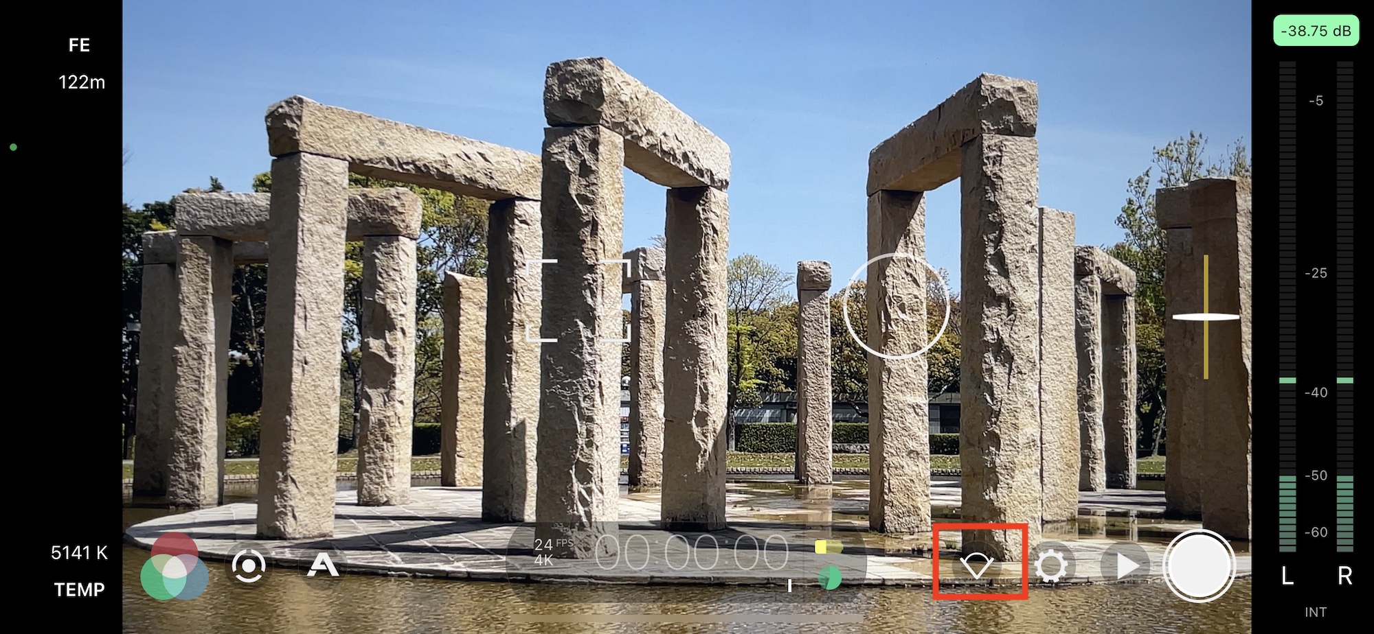 撮影中のタイムコードは中央にあるタイムコードメダリオンから確認できるほか、タイムコードメダリオンをタップすればヒストグラムなどの波形モニターが表示されます。