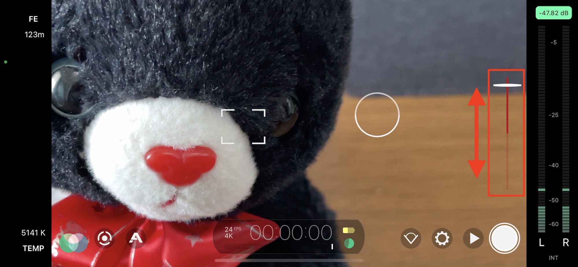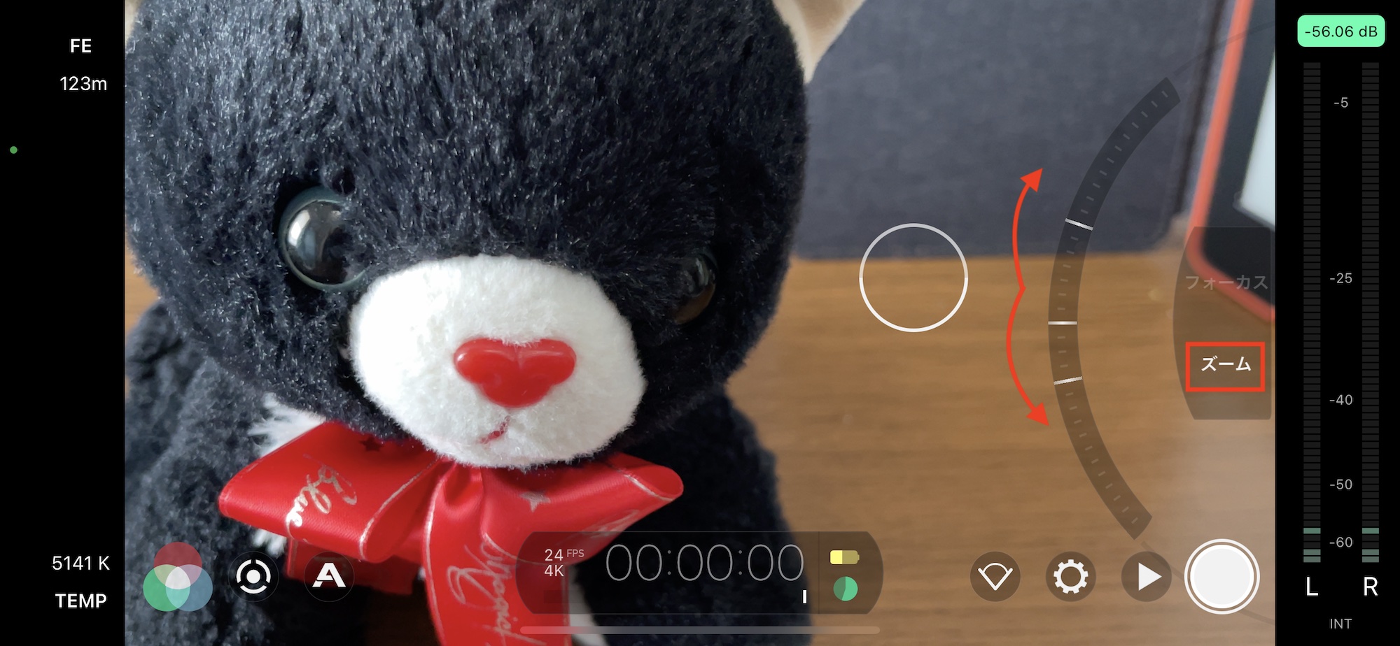 FilMic Proでズームを行う場合はズームロッカーを上下にスライドするか、右側をスワイプして「ズーム」をタップした上でアークスライダーを動かせば出来ます。ちなみにこのズームはデジタルズームであるため、画質が劣化するので注意しましょう。
