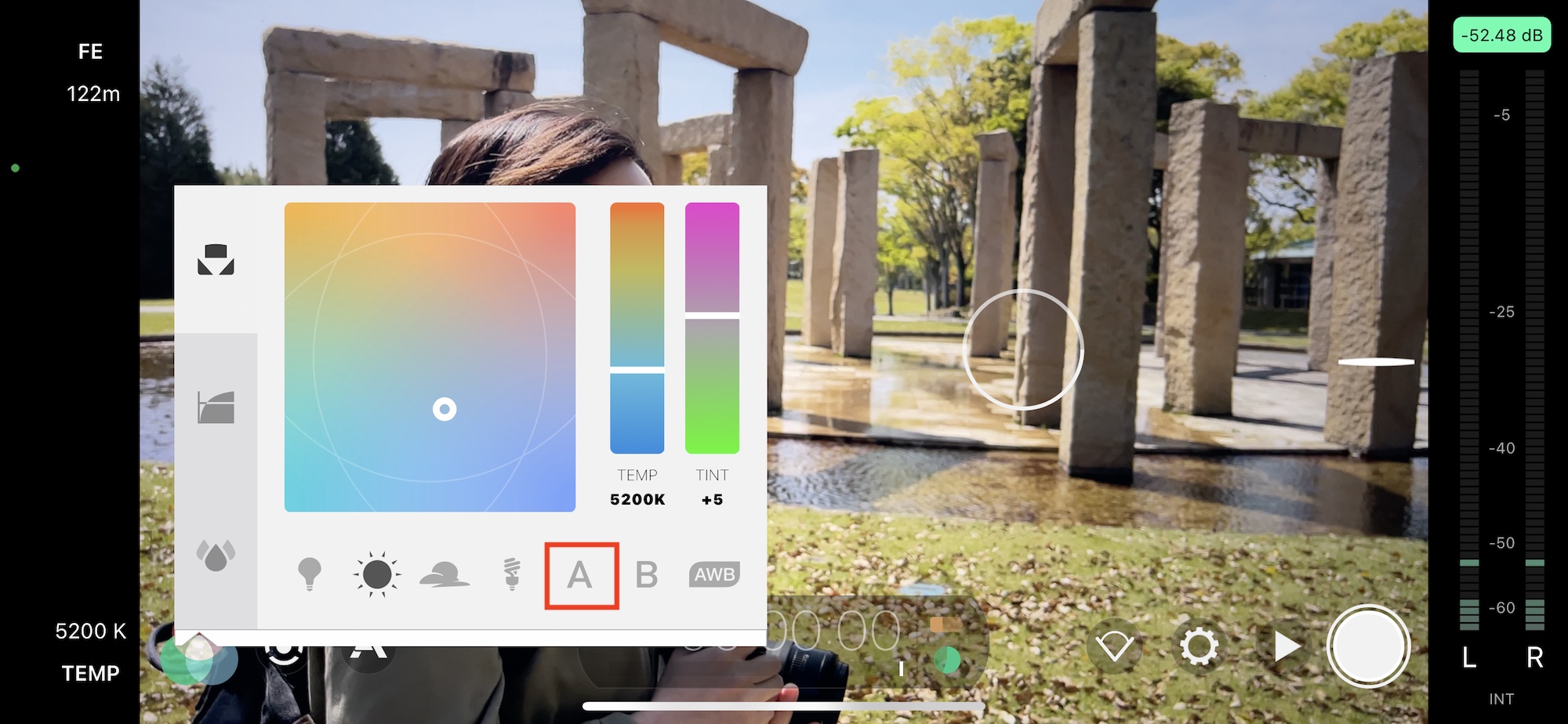 デフォルトではオートホワイトバランス(AWB)の状態になっていますが、下の各アイコンからプリセットをタップするか、中央のマトリクスビューまたはTEMPの項目からケルビンの単位でホワイトバランスを調整できます。