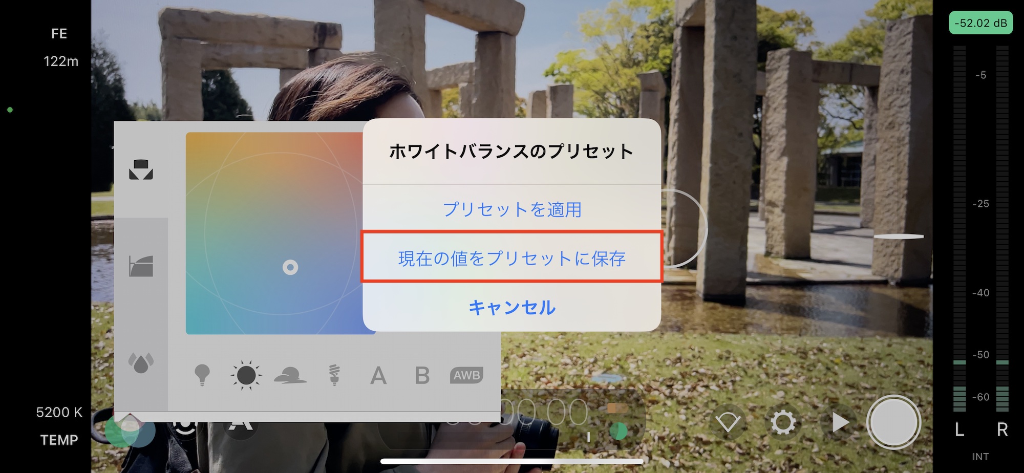 「A」または「B」を長押しすると「ホワイトバランスのプリセット」が現れるので、「現在の値をプリセットに保存」をタップすればいつでも呼び出す事ができます。