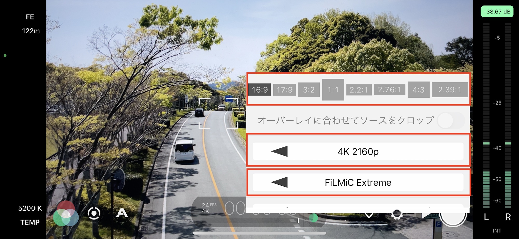 FilMic ProではフルHDや4K(UHD)といったフレームサイズの変更やコーデック、フレームレートなど細かな設定を行えます。