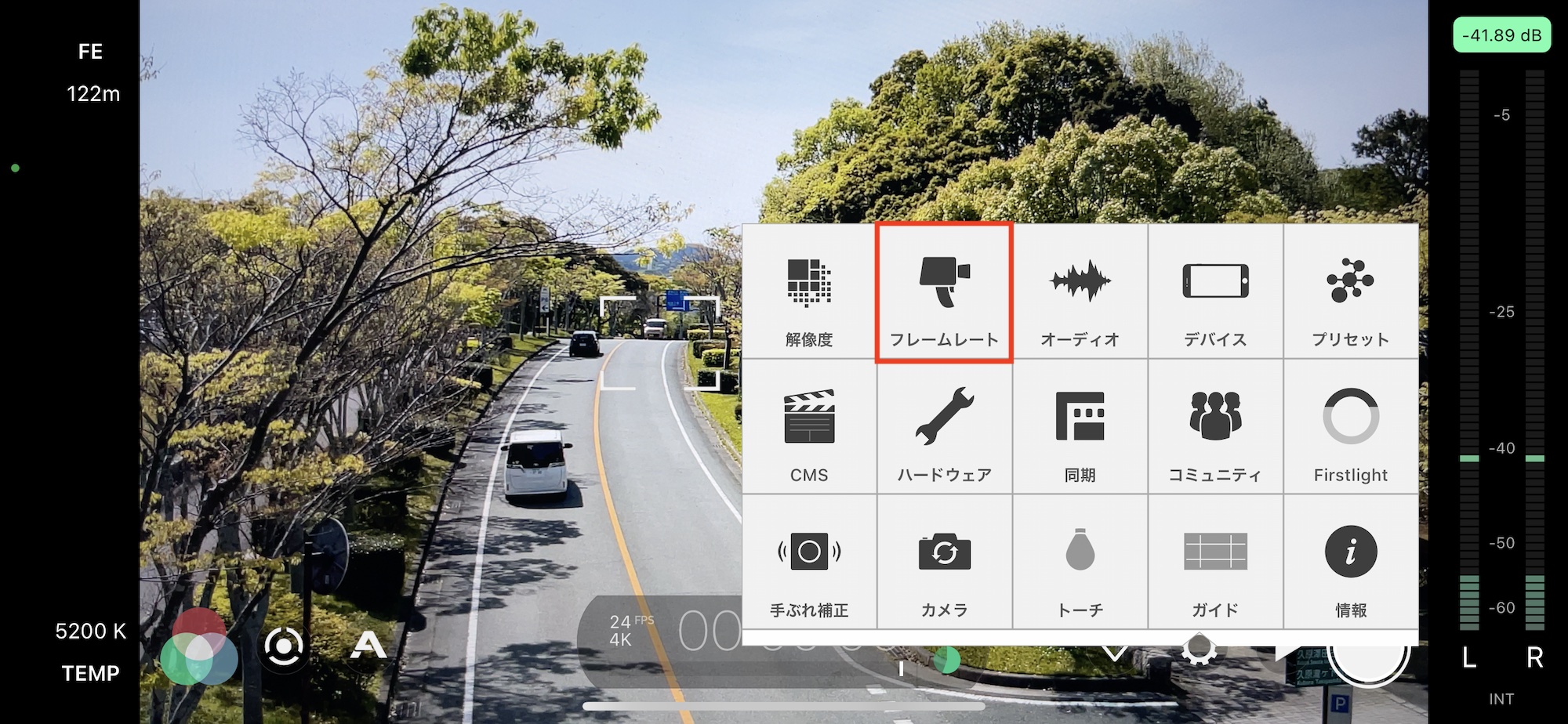 設定画面の「フレームレート」を開くとフレームレートを設定できます。上部の一覧から撮影したいフレームレートを選ぶと良いでしょう。