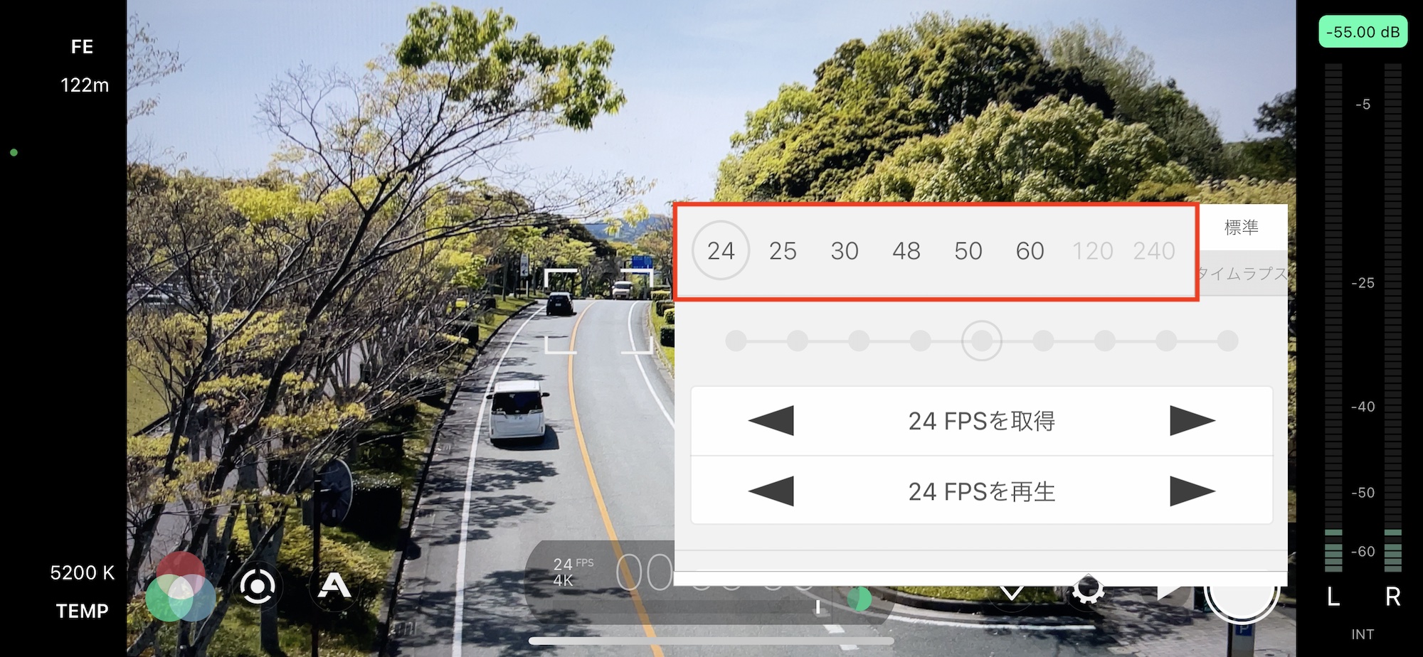 例えば60fpsで撮影して記録後に24fpsのスローモーションとして再生する場合は「60FPSを取得」、「24FPSを再生」に設定します。