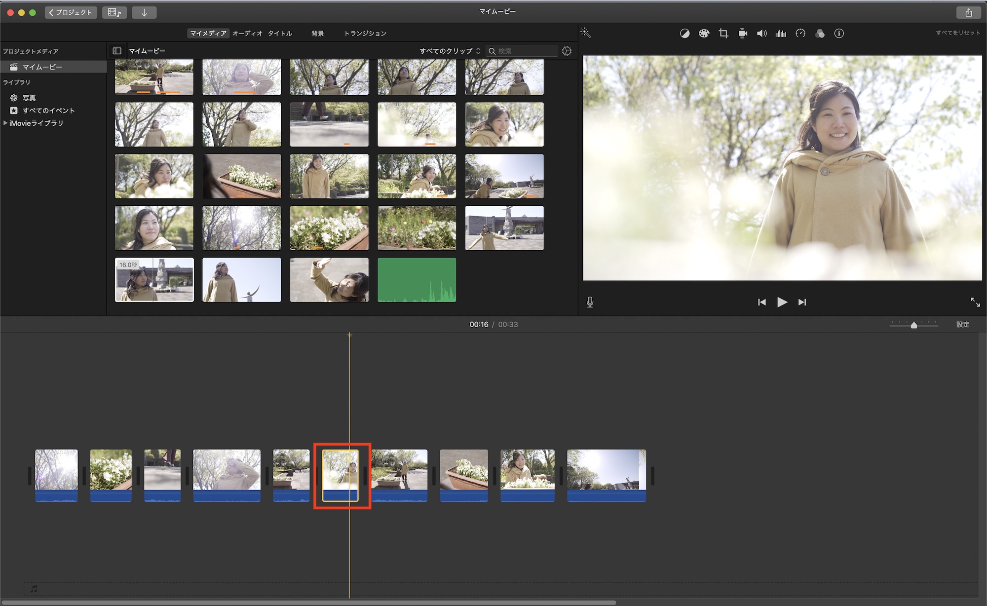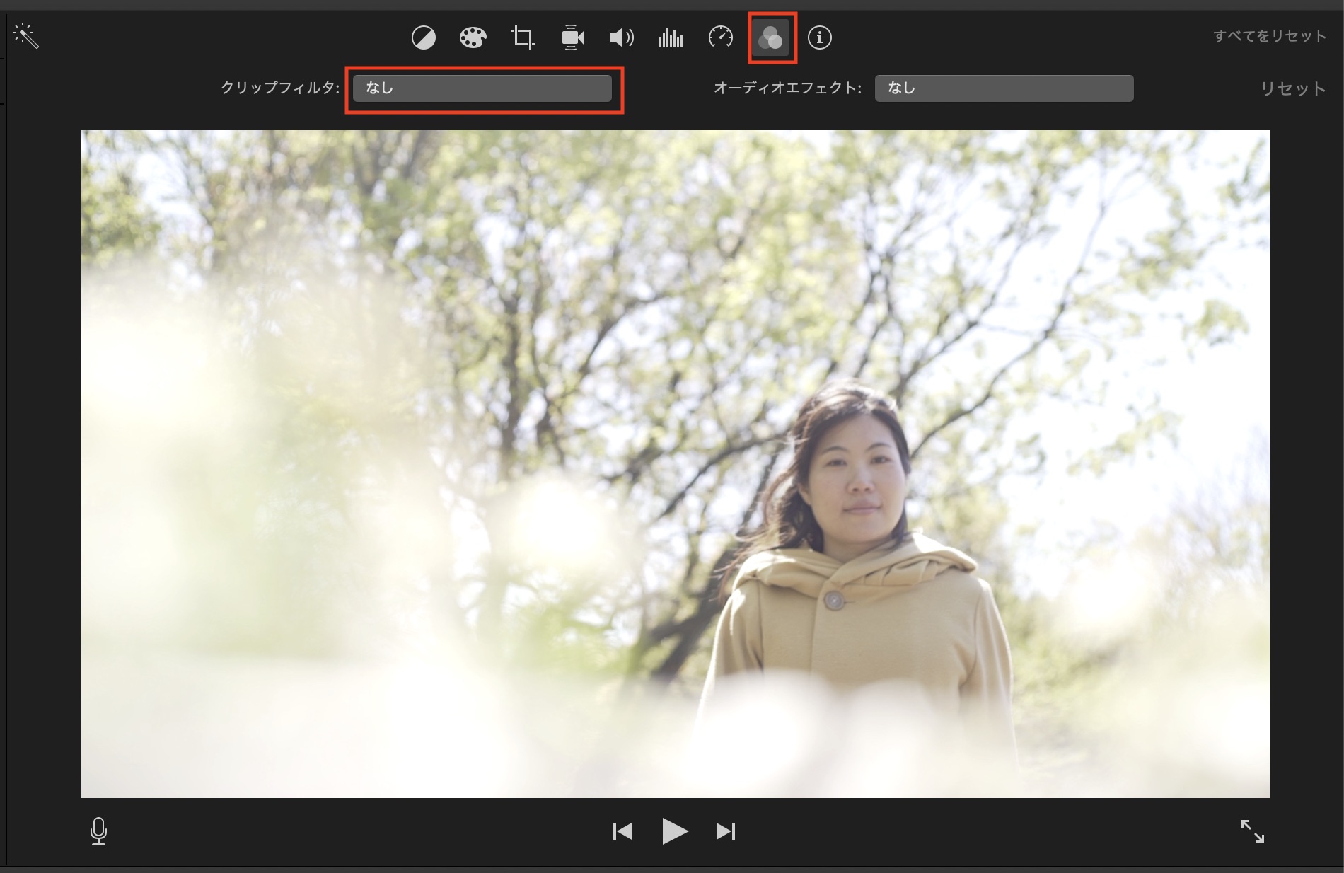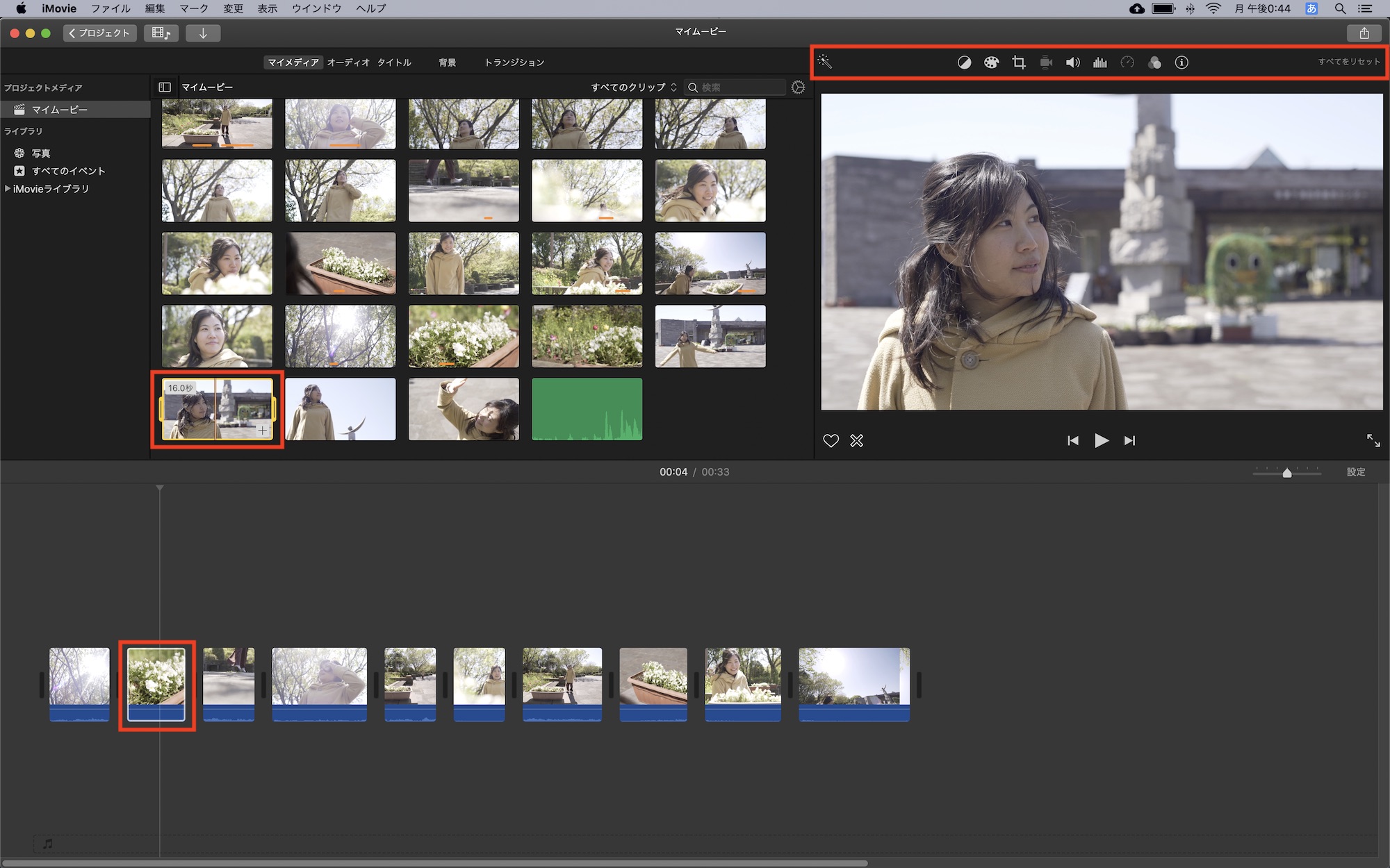 iMovieで色補正などのツールを使用するにはタイムラインまたはブラウザに表示しているクリップを選択して、ビューアー上部のツールバーから適用したいエフェクトを加えることが出来ます。