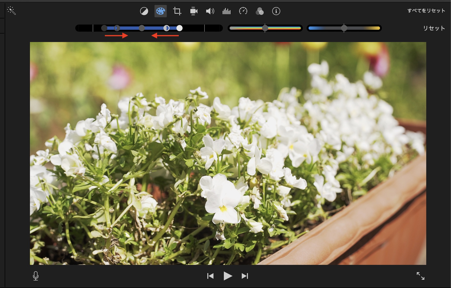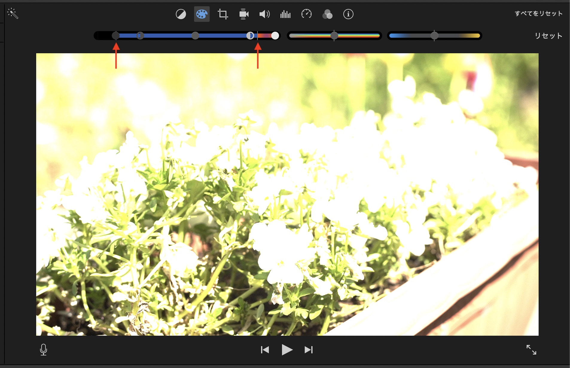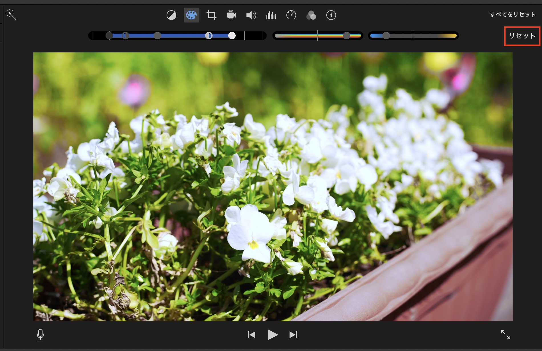 iMovieで色補正などのツールを使用するにはタイムラインまたはブラウザに表示しているクリップを選択して、ビューアー上部のツールバーから適用したいエフェクトを加えることが出来ます。