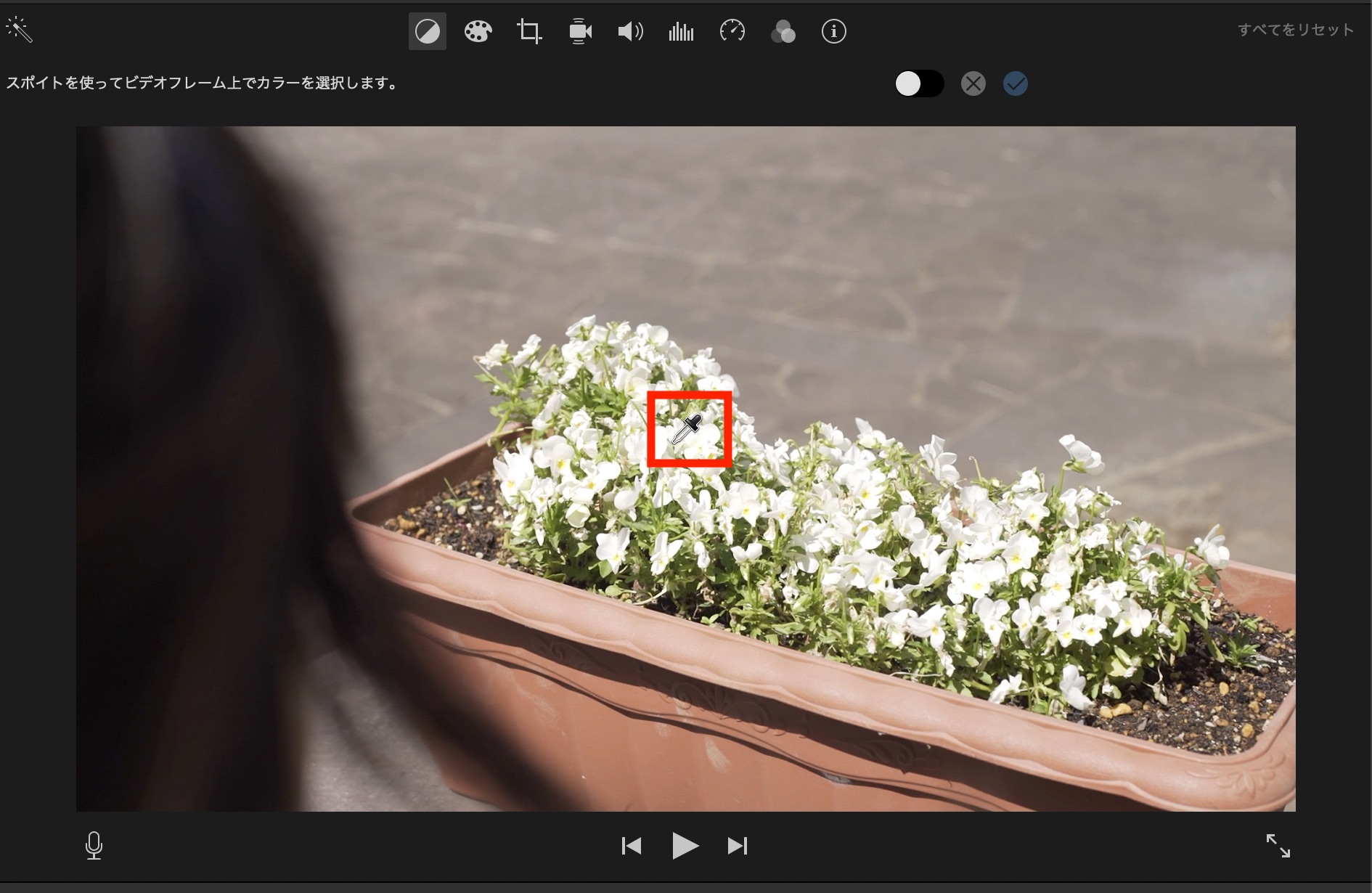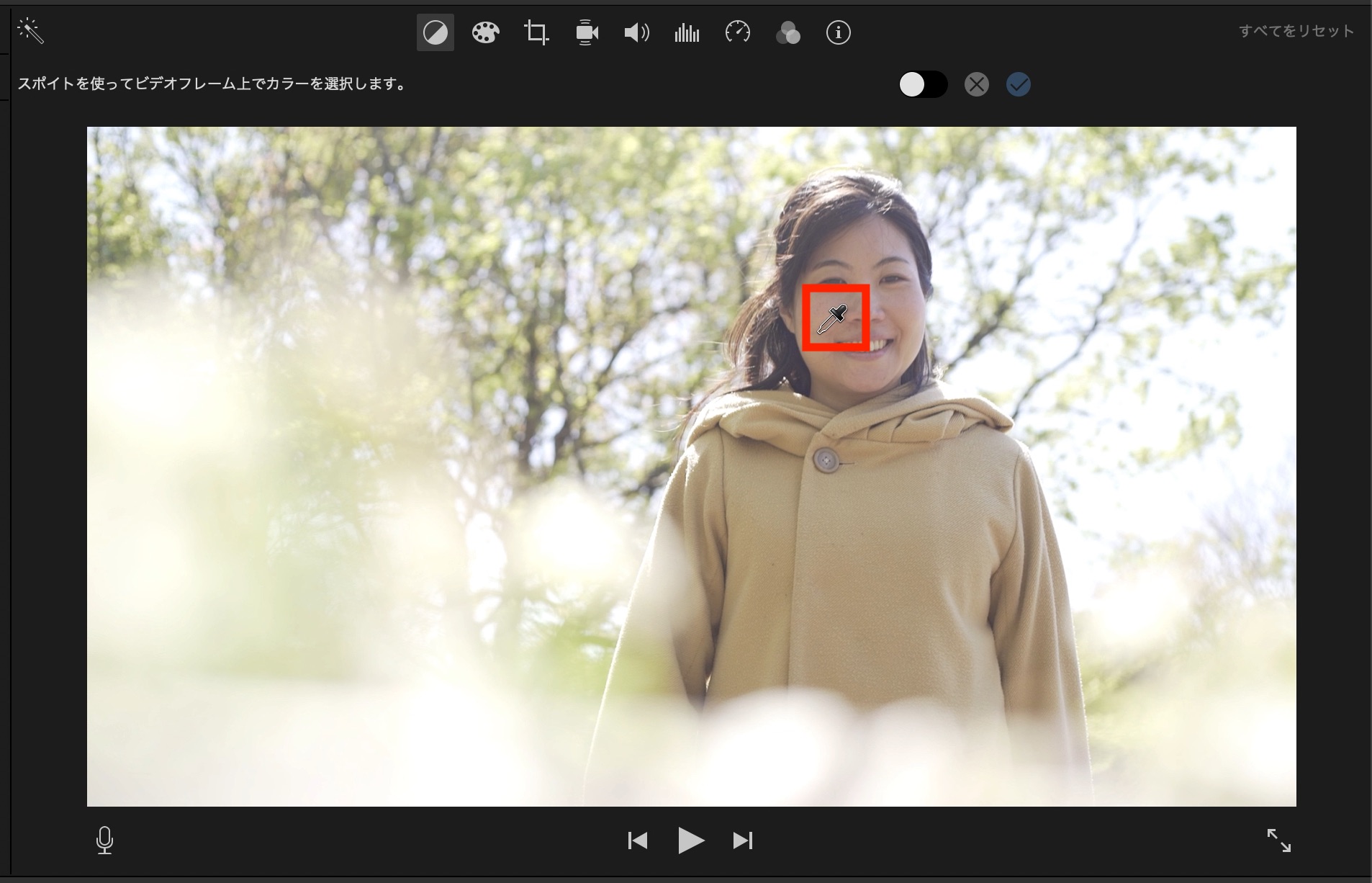 マッチカラーをオンにするとカーソルがスポイトに変化するので、タイムラインをスキミング(スクラブ)してマッチしたいフレームを選択します。