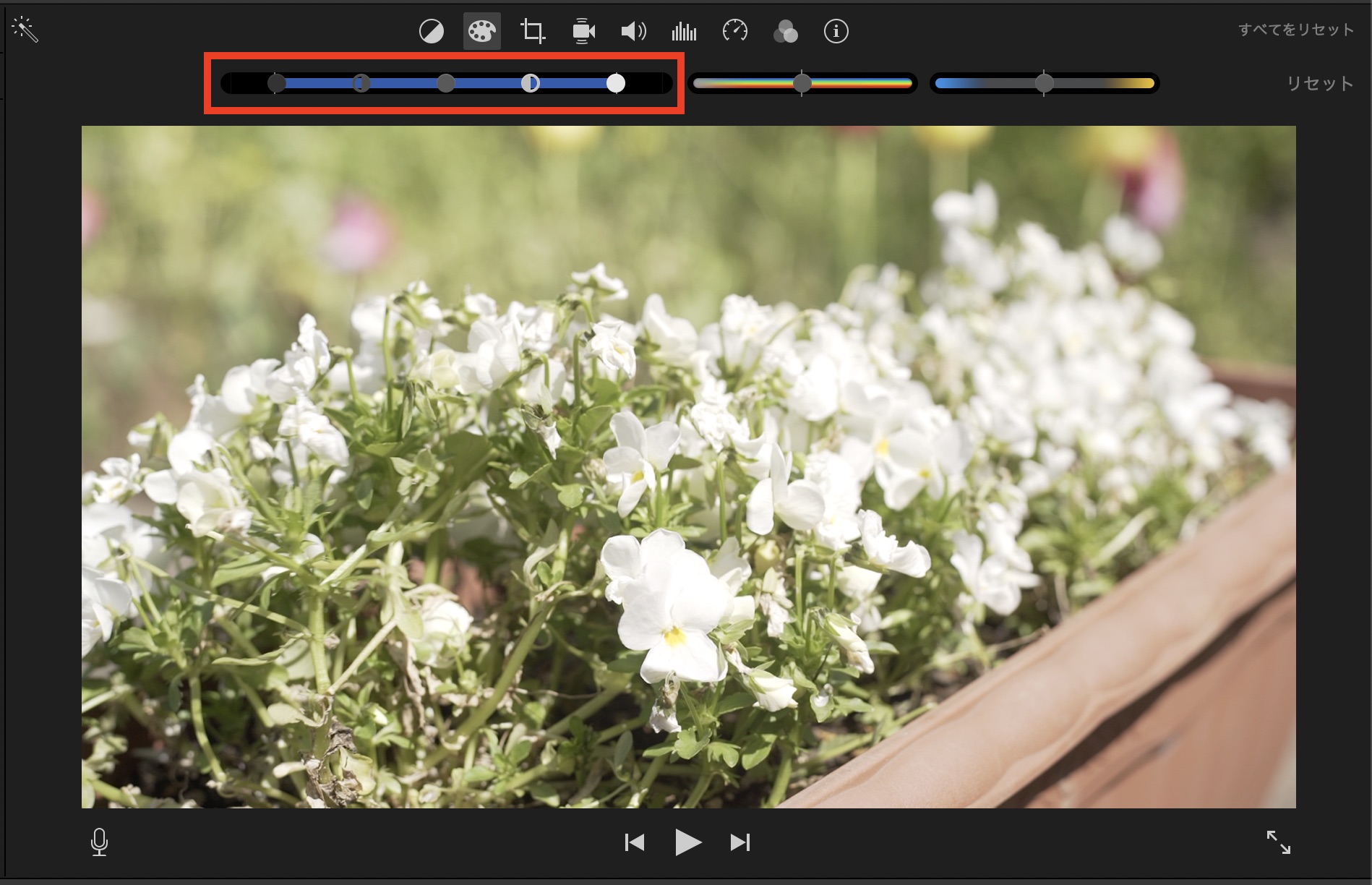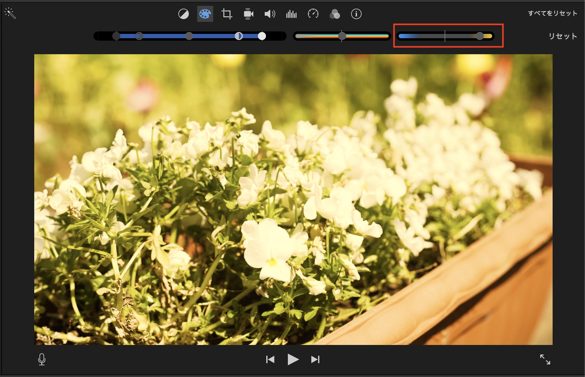 最後のスライダーは色温度(ホワイトバランス)です。左側に動かすと青っぽく、右だとオレンジっぽくクリップの色が変化します。
