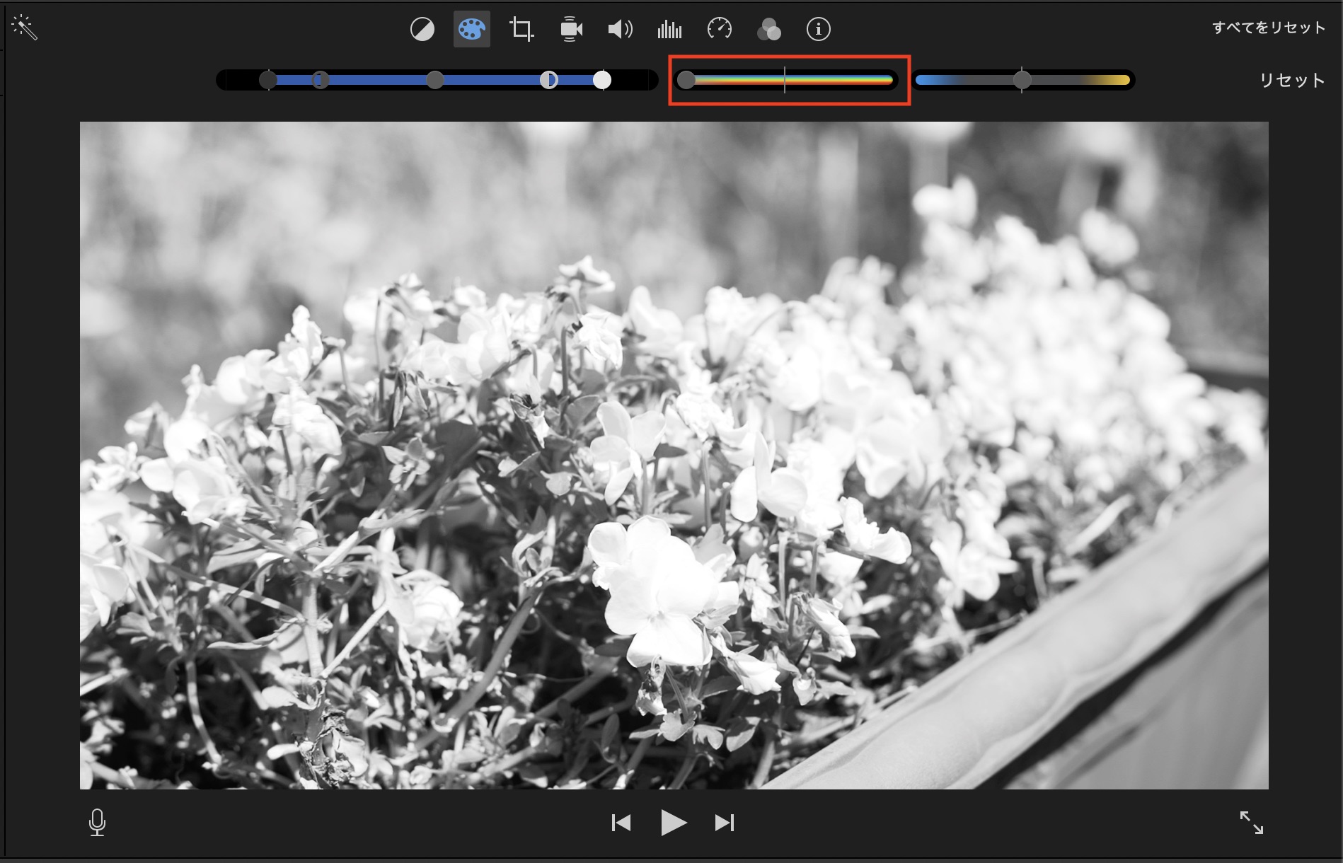 2つ目のスライダーはサチュレーション(彩度)になります。左側に持っていくと白黒になり、右側に持っていくと鮮やかな色に変化します。