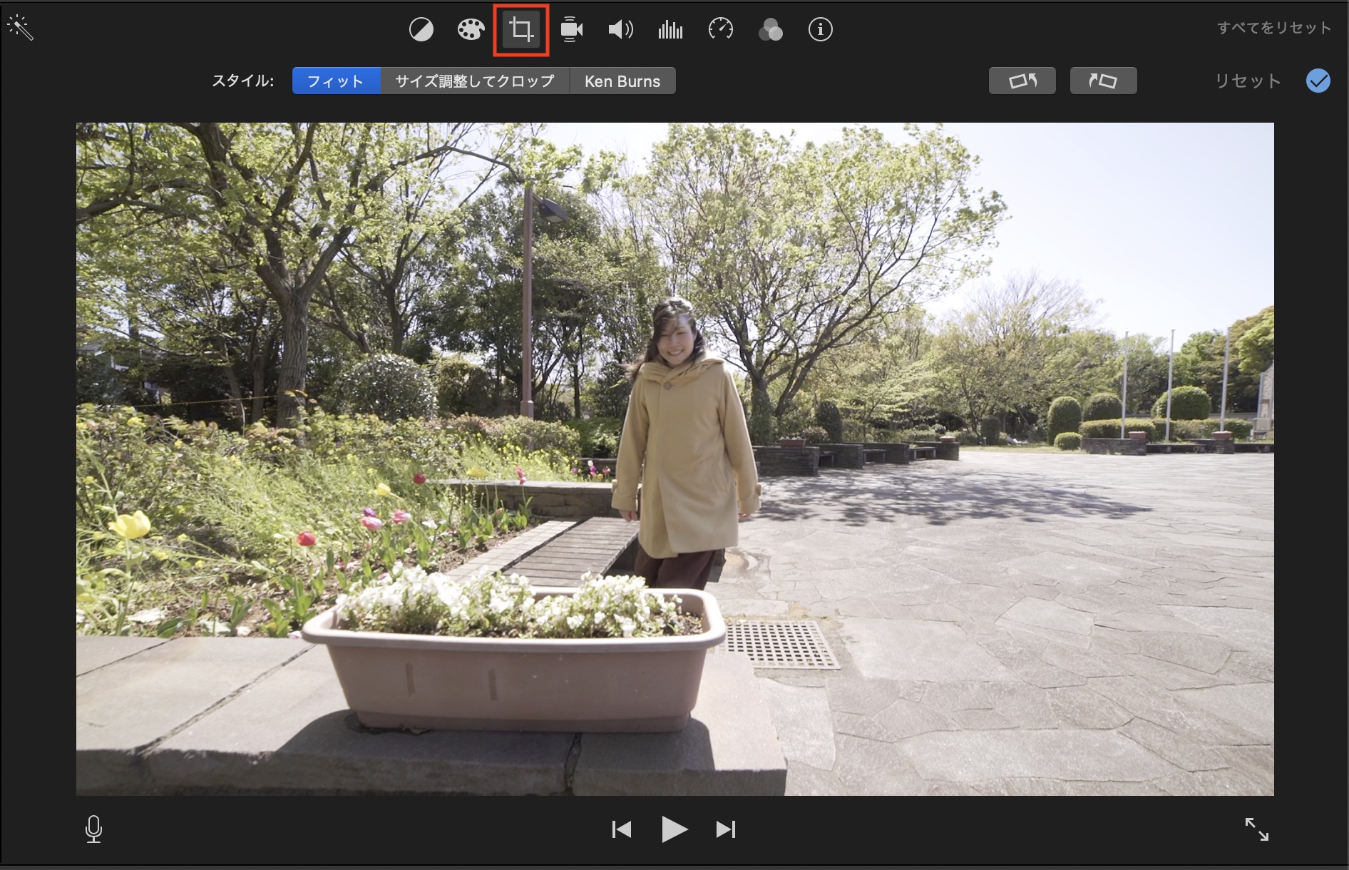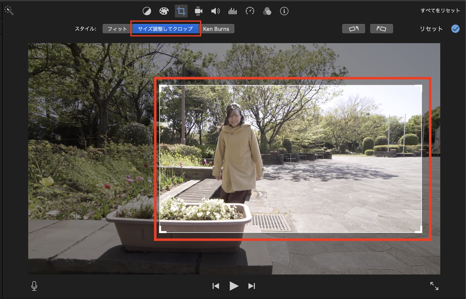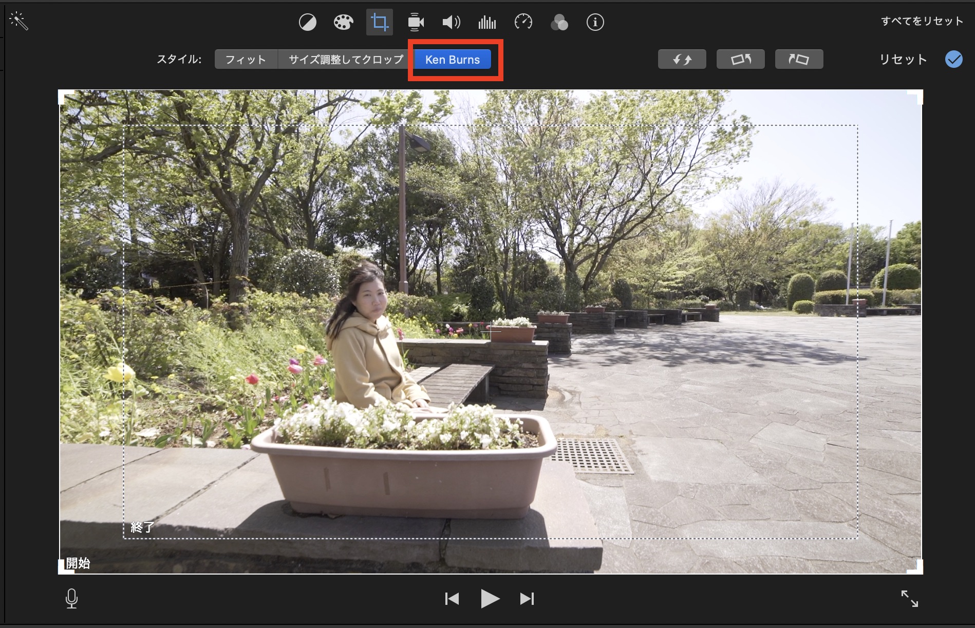 クリップのサイズ調整やKen Burnsエフェクトが使えます。「フィット」を選択した場合、アスペクト比が4:3などの写真が16:9に収まるように調整されます。