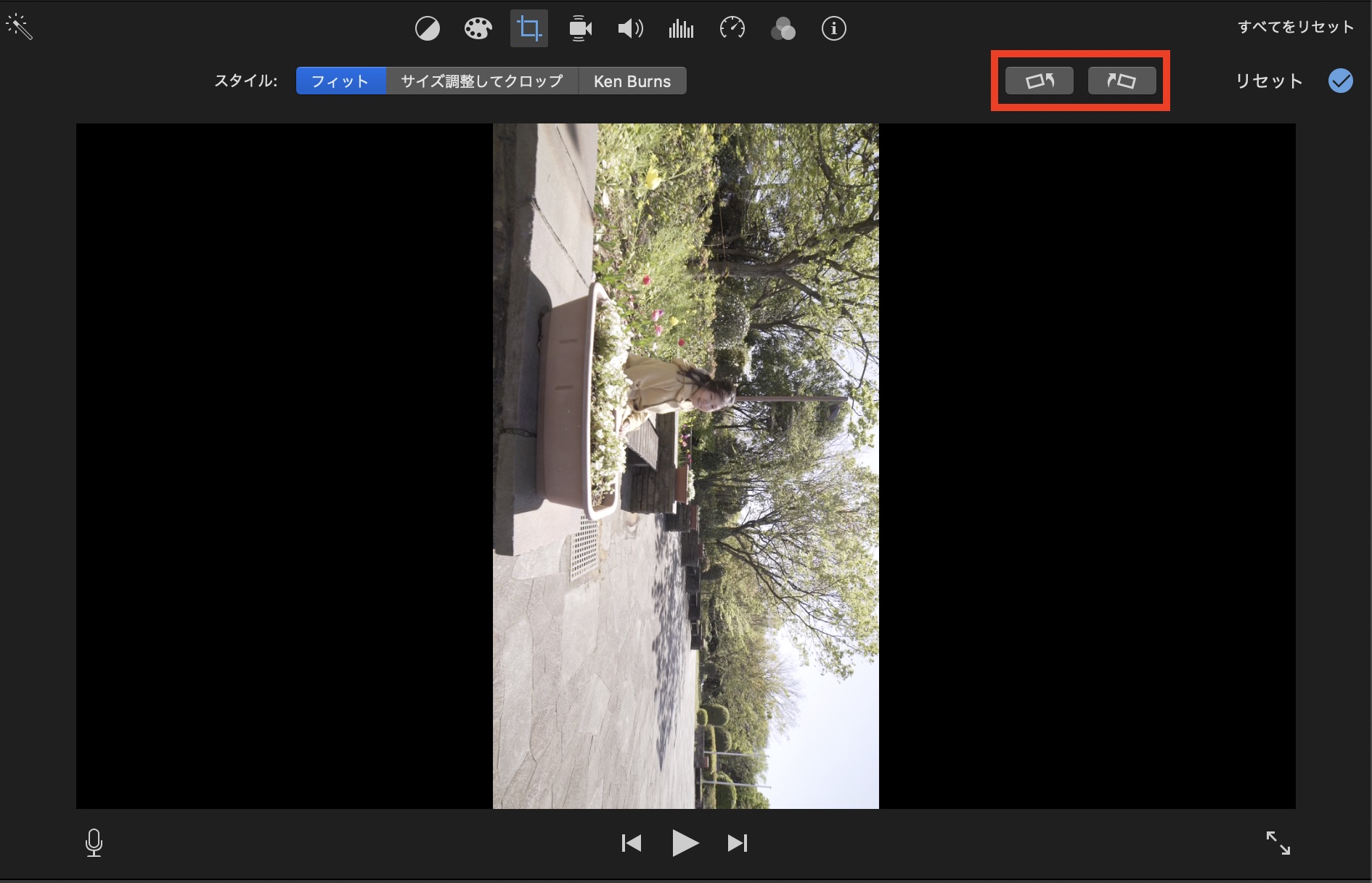 クリップを回転させたい場合は一番右の回転アイコンをクリックして反時計回り、時計回りの方向で回転できます。