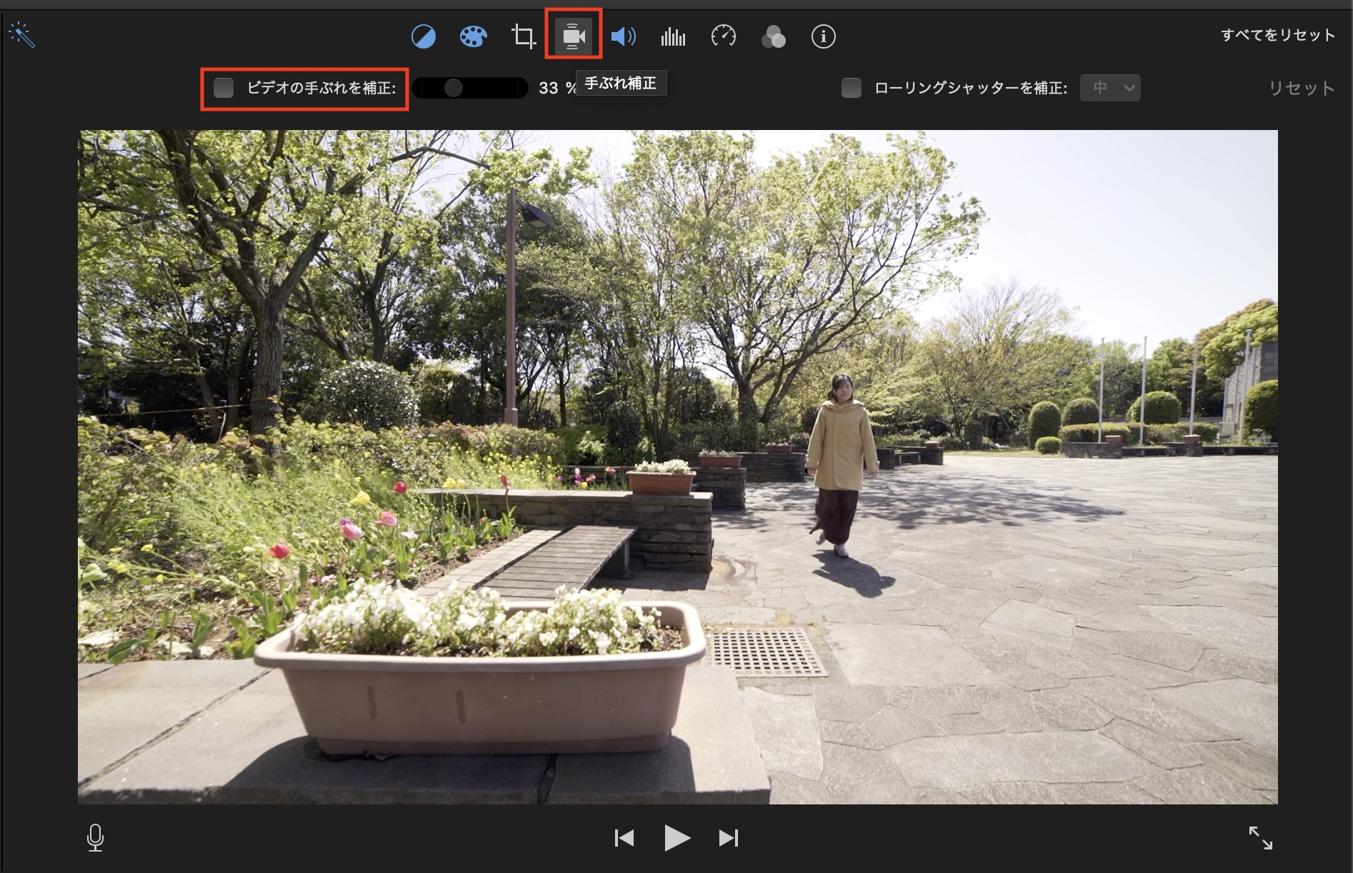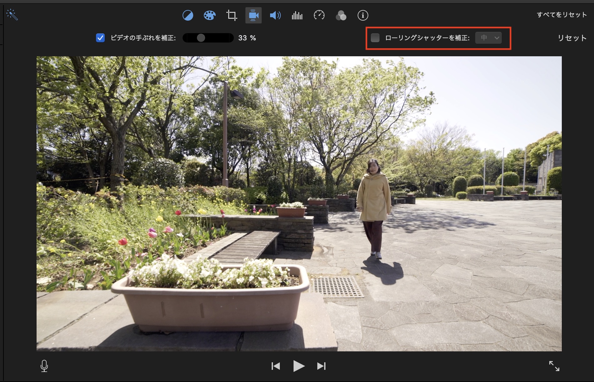 「ローリングシャッターを補正」ではクリップの歪みなどを調整してくれる機能です。必要に応じて横のドロップダウンメニューから強度を調整することも可能です。