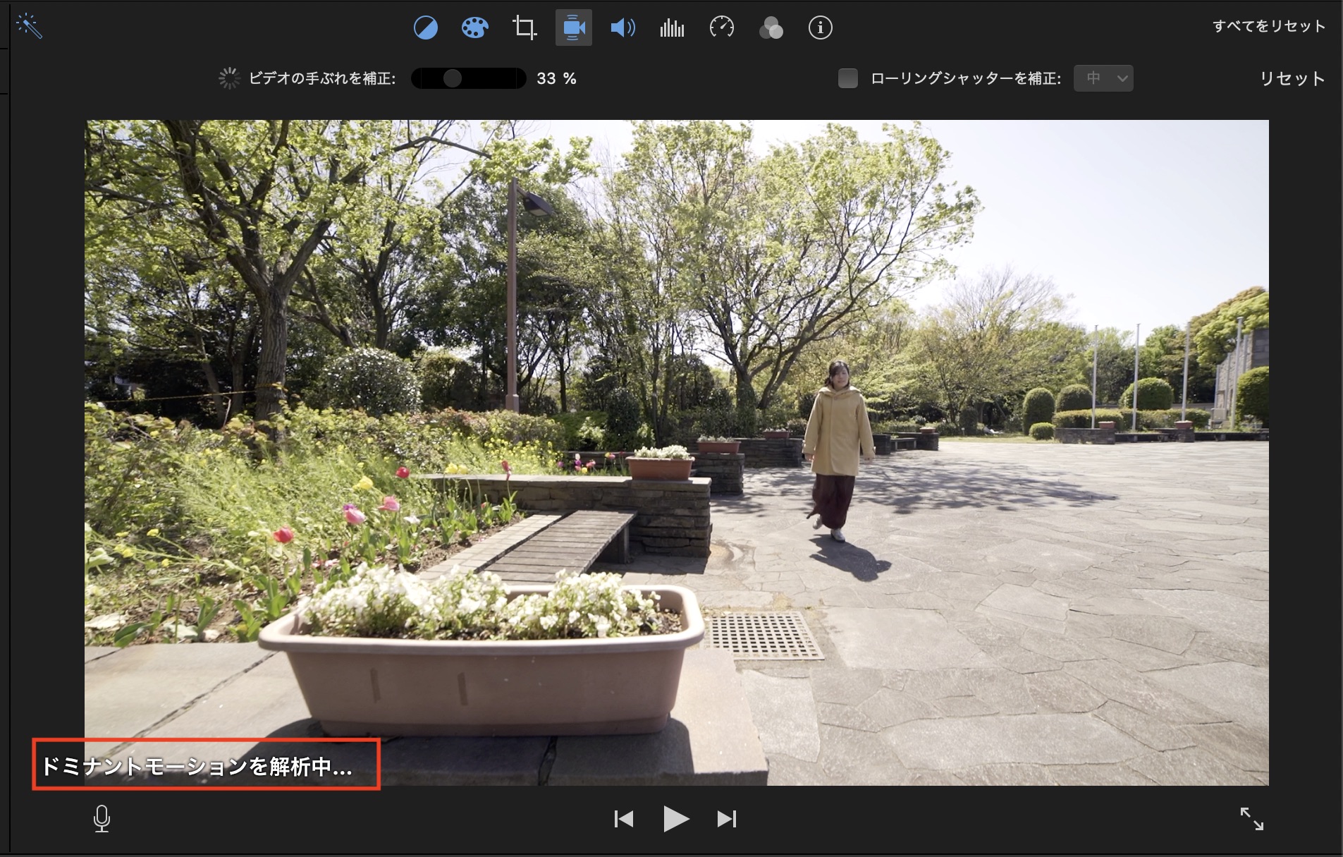 iMovieではFinal Cut Proと同じように手ぶれ補正機能が利用できます。「ビデオの手ぶれを補正」にチェックを入れると「ドミナントモーションを解析中」が表示され解析が始まるので、完了するまで待ちましょう。