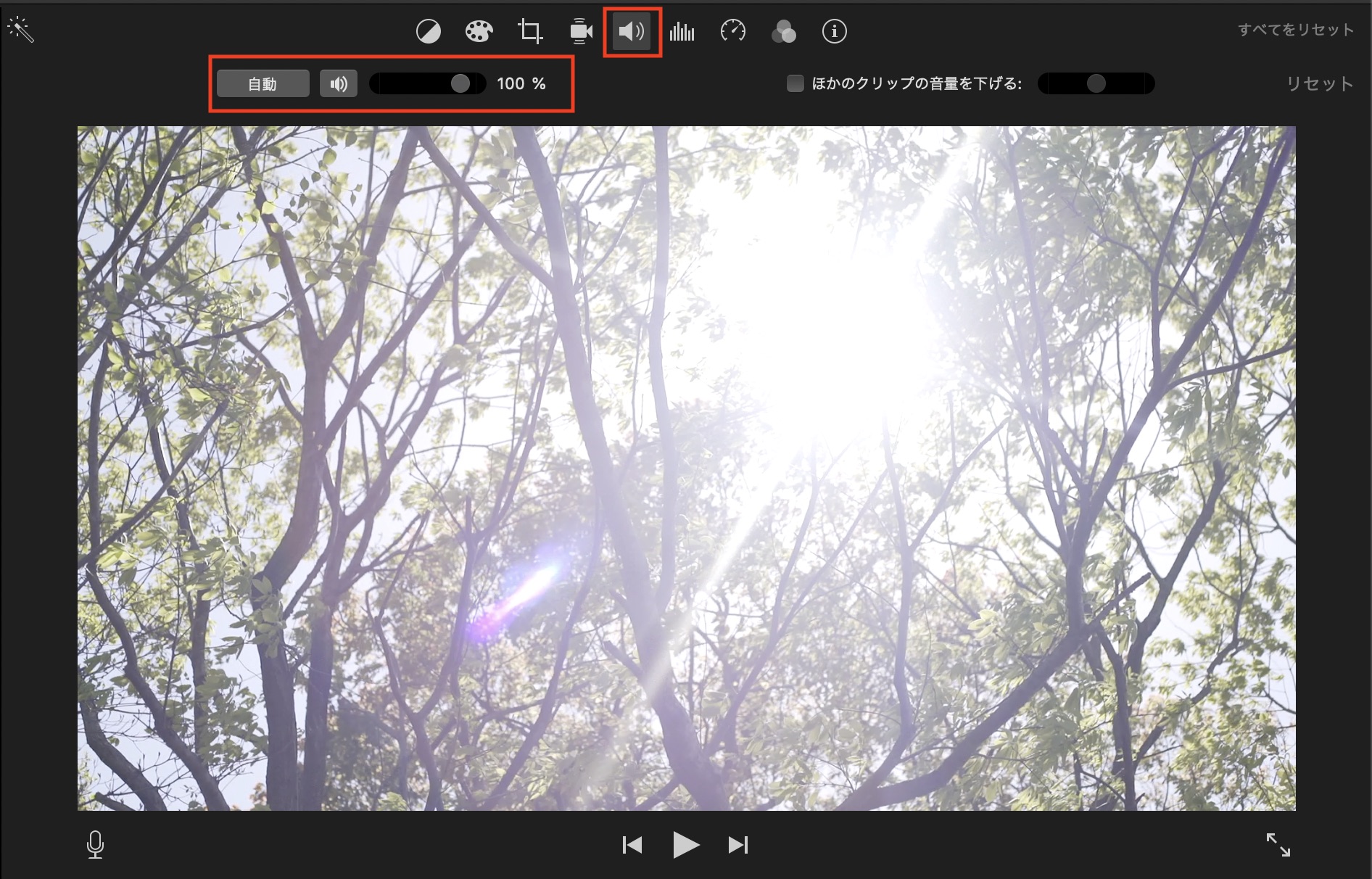 クリップの音量を調整できます。「自動」をクリックして自動調整を行うか、スライダーを操作して手動で調整します。ミュートにする場合はスピーカーアイコンをクリックして切り替えます。