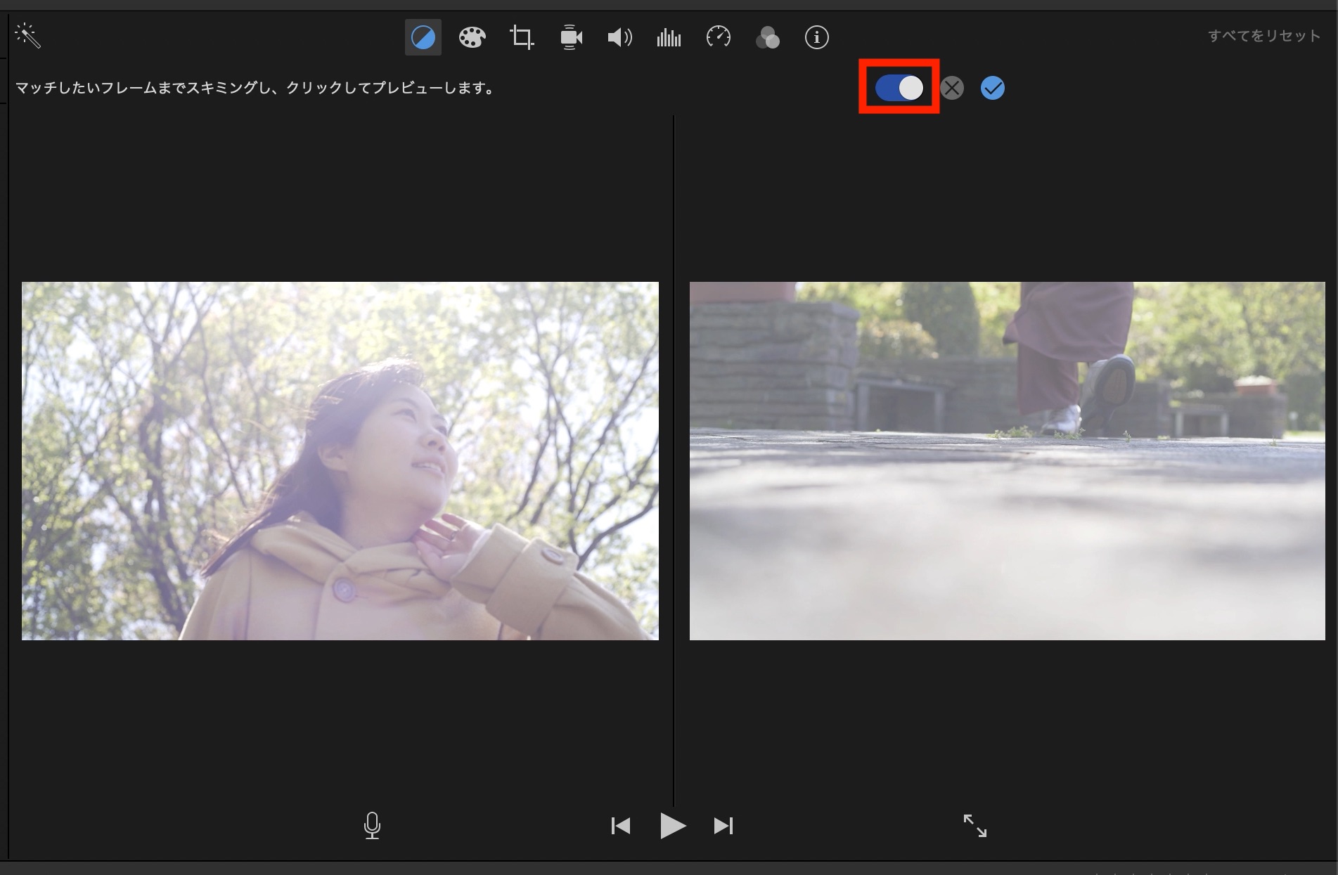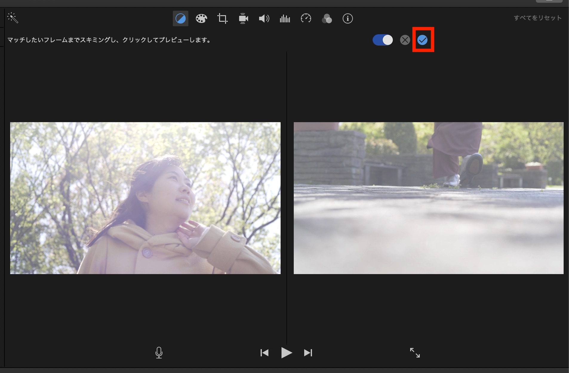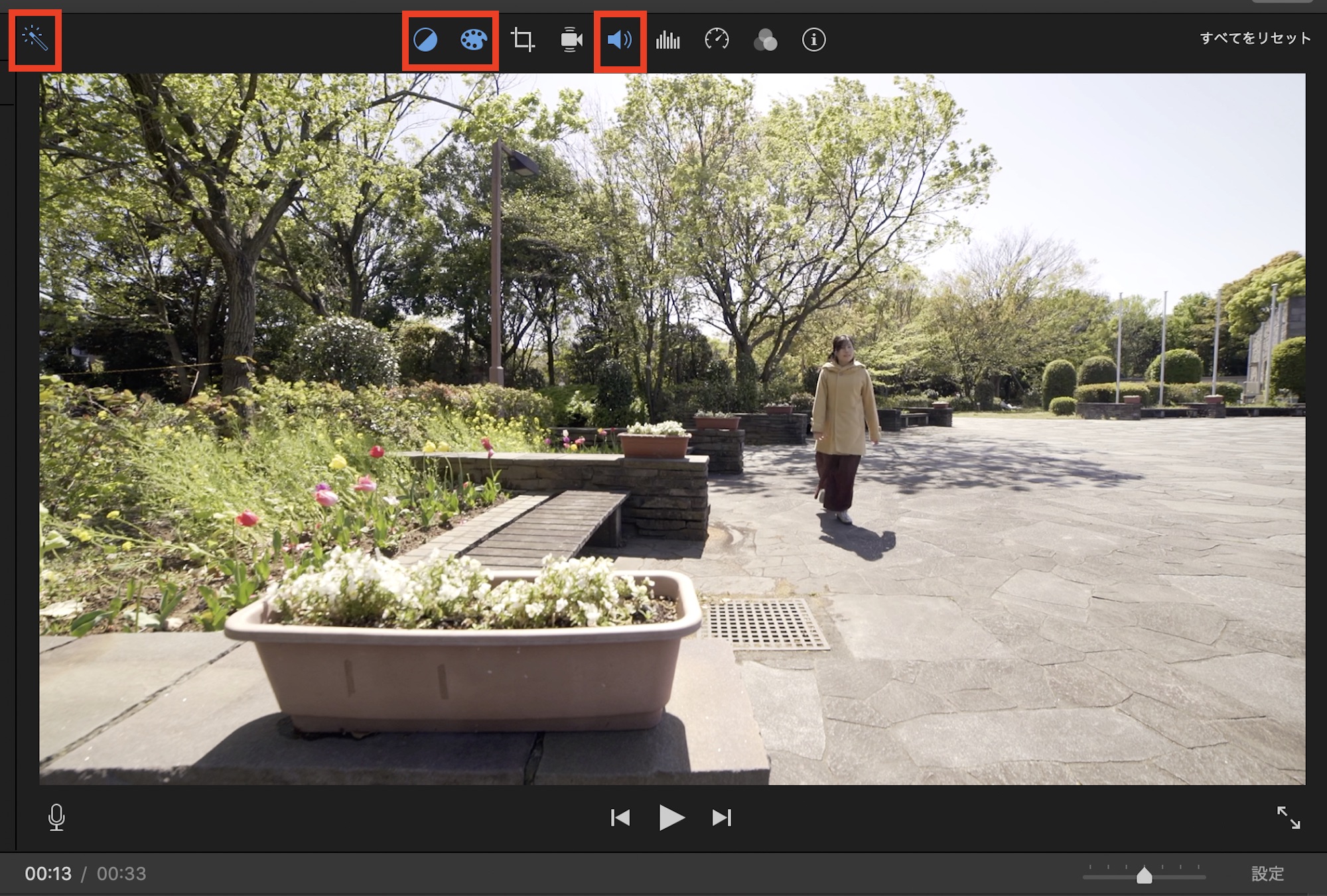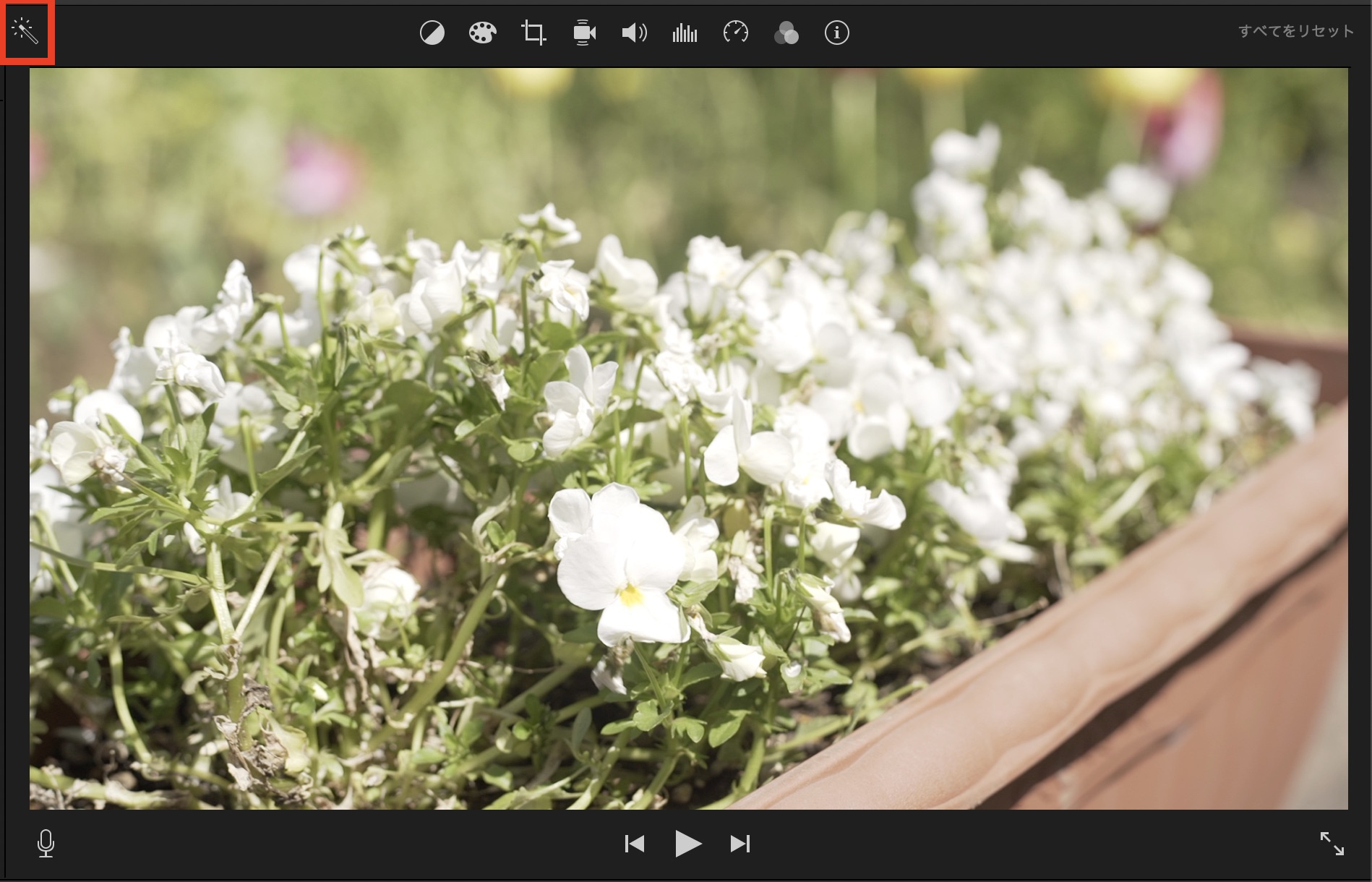 クリップの見た目や音量などをワンクリックで調整したい場合は一番左にあるステッキアイコン(選択したクリップ/オーディオ品質を自動で向上させます)をクリックすると、iMovieが必要だと思うエフェクトを自動で追加してくれます。