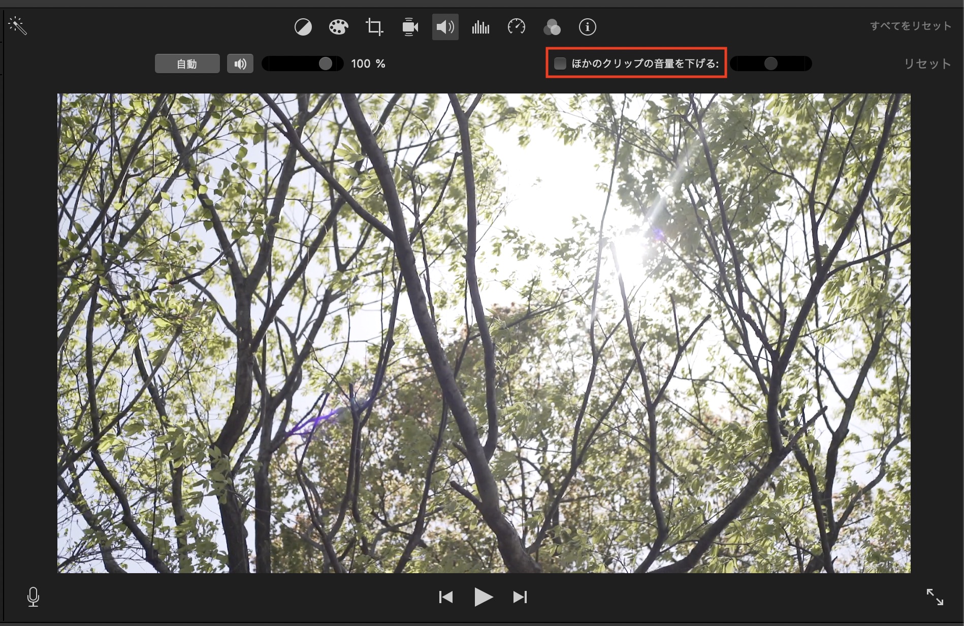 「ほかのクリップの音量を下げる」の項目では選択したクリップ以外のクリップの音量をまとめて調整できます。
