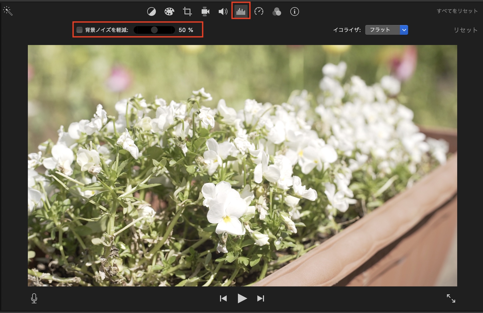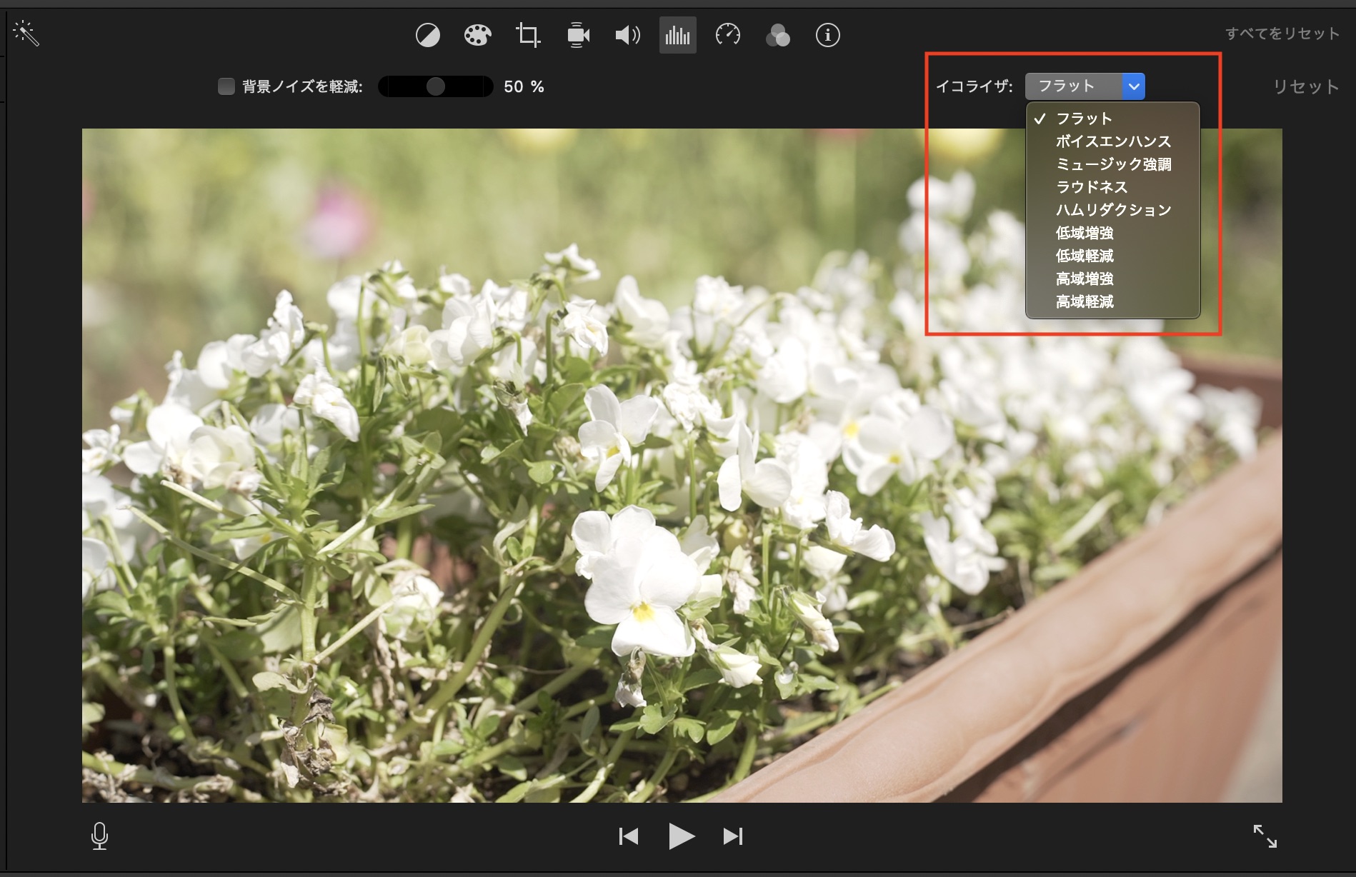 「背景ノイズを軽減」では背景に聞こえる風の音などのノイズを軽減させることが可能です。スライダーを動かして強度を調整することができますが、クリップによっては上手く反映出来ない場合もあるので、注意しましょう。