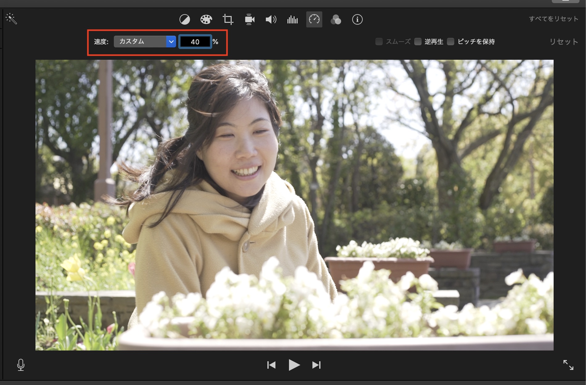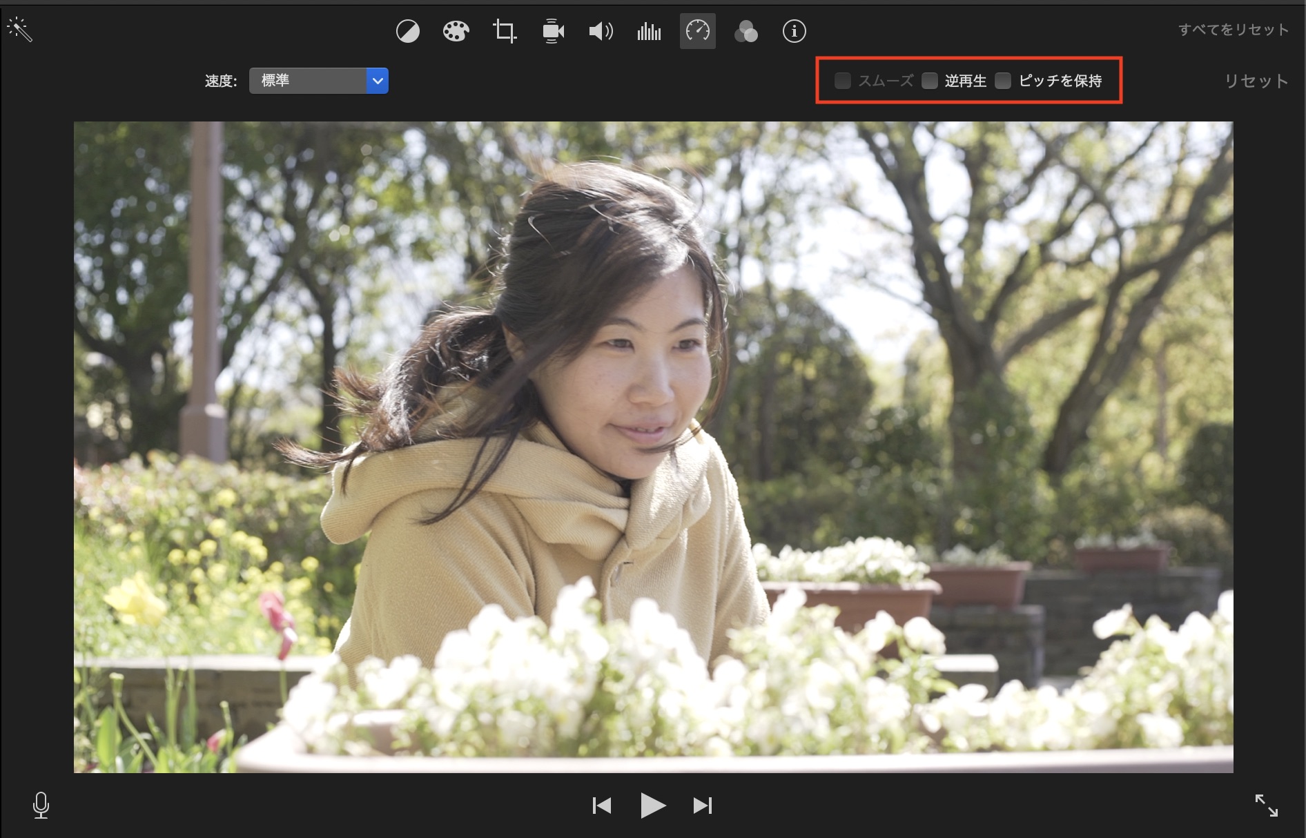 「逆再生」にチェックを入れてクリップを逆再生したり、音声のピッチを維持する場合は「ピッチを保持」を選択すると良いでしょう。