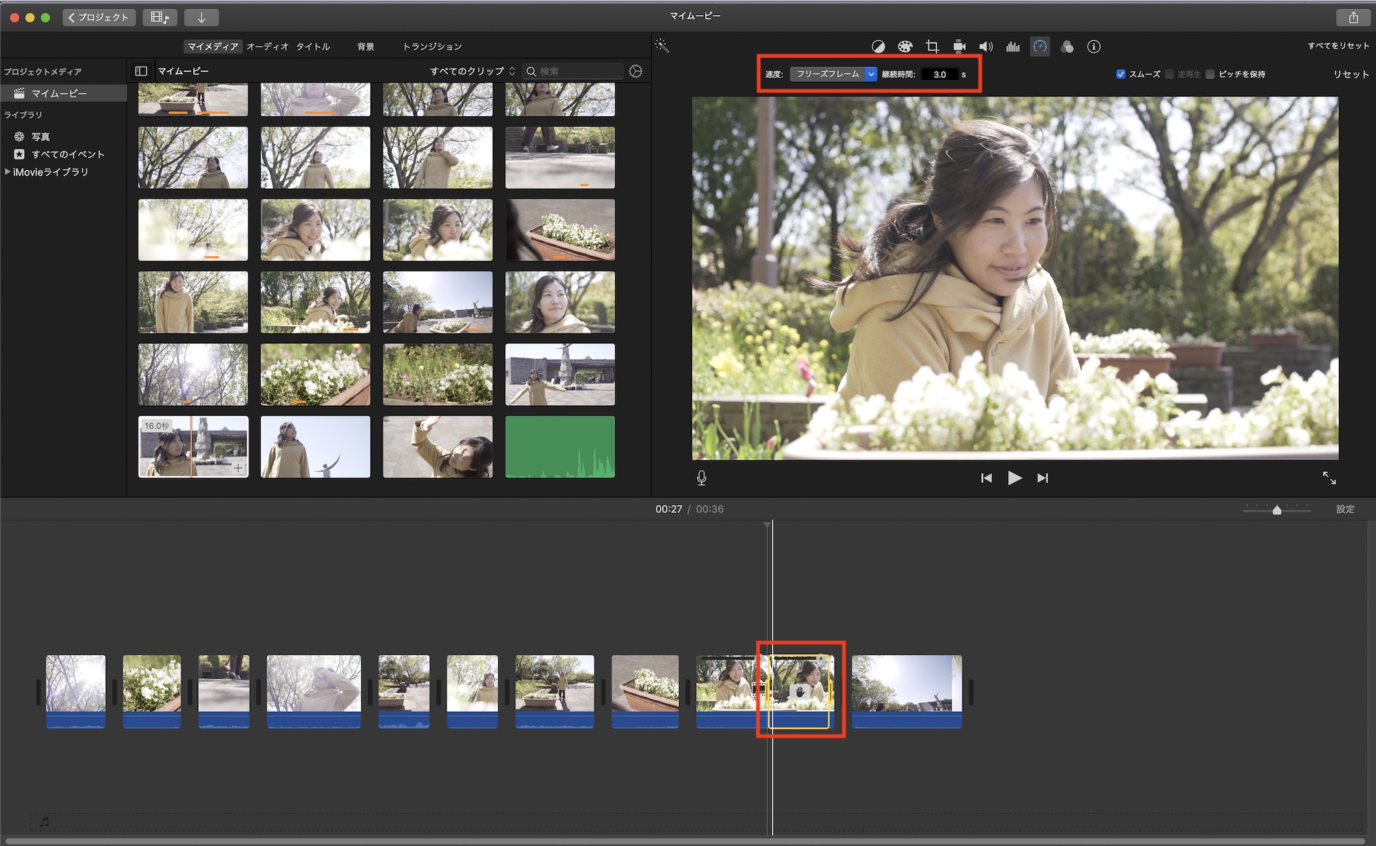 クリップの一部を静止画として使いたい場合は「フリーズフレーム」を選択するとクリップに手のアイコンが表示されるので、静止するタイミングを調整できます。