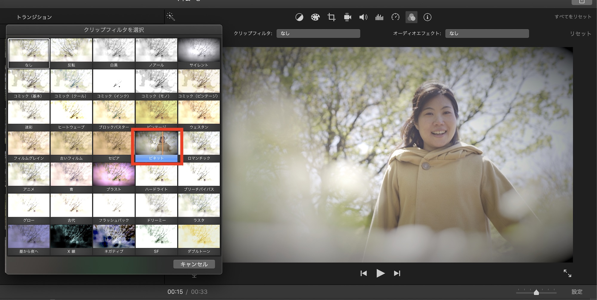 クリップの映像や音声にInstagramのようなフィルターを適用することができます。デフォルトでは「なし」となっていますが、「なし」の部分をクリックすると別ウィンドウが現れるので、フィルターをプレビューできます。