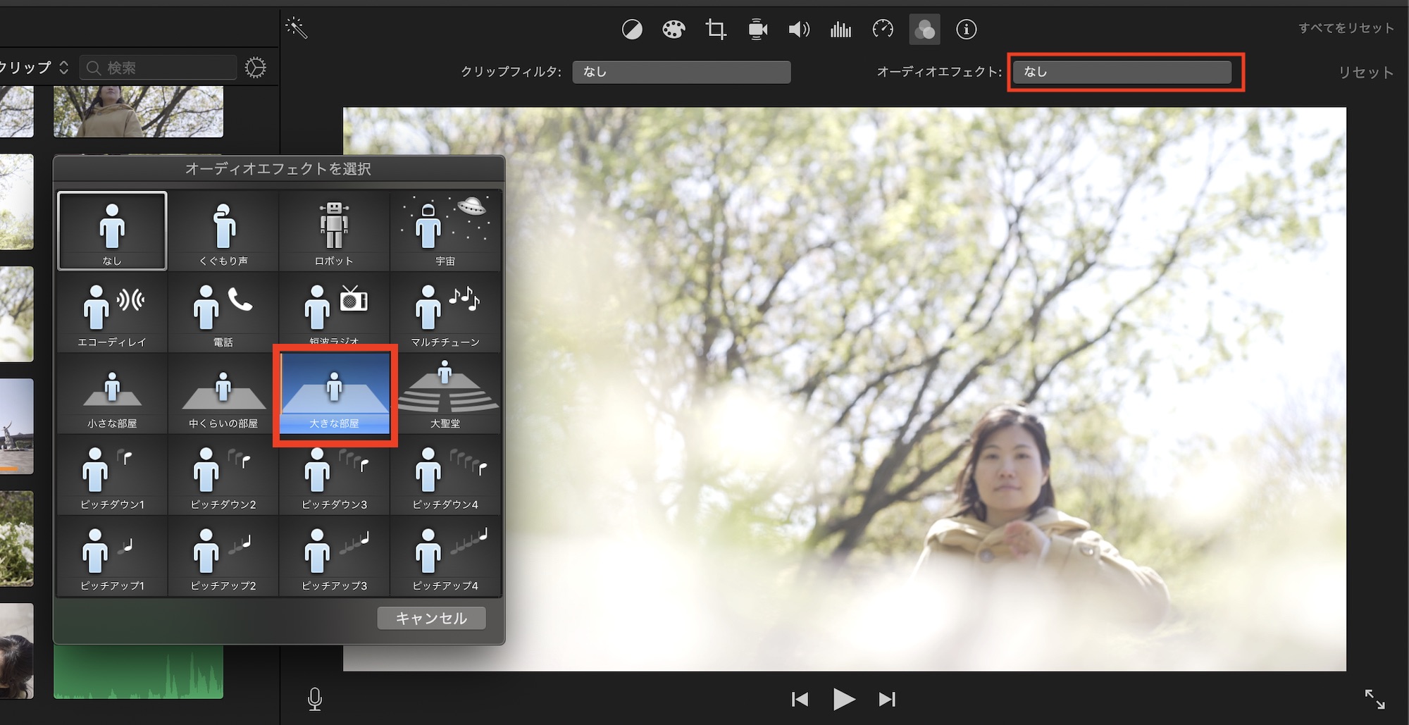 オーディオエフェクトも同様に一覧表示され、マウスーバーすることでプレビュー可能です。適用したいエフェクトをクリックすれば反映されます。