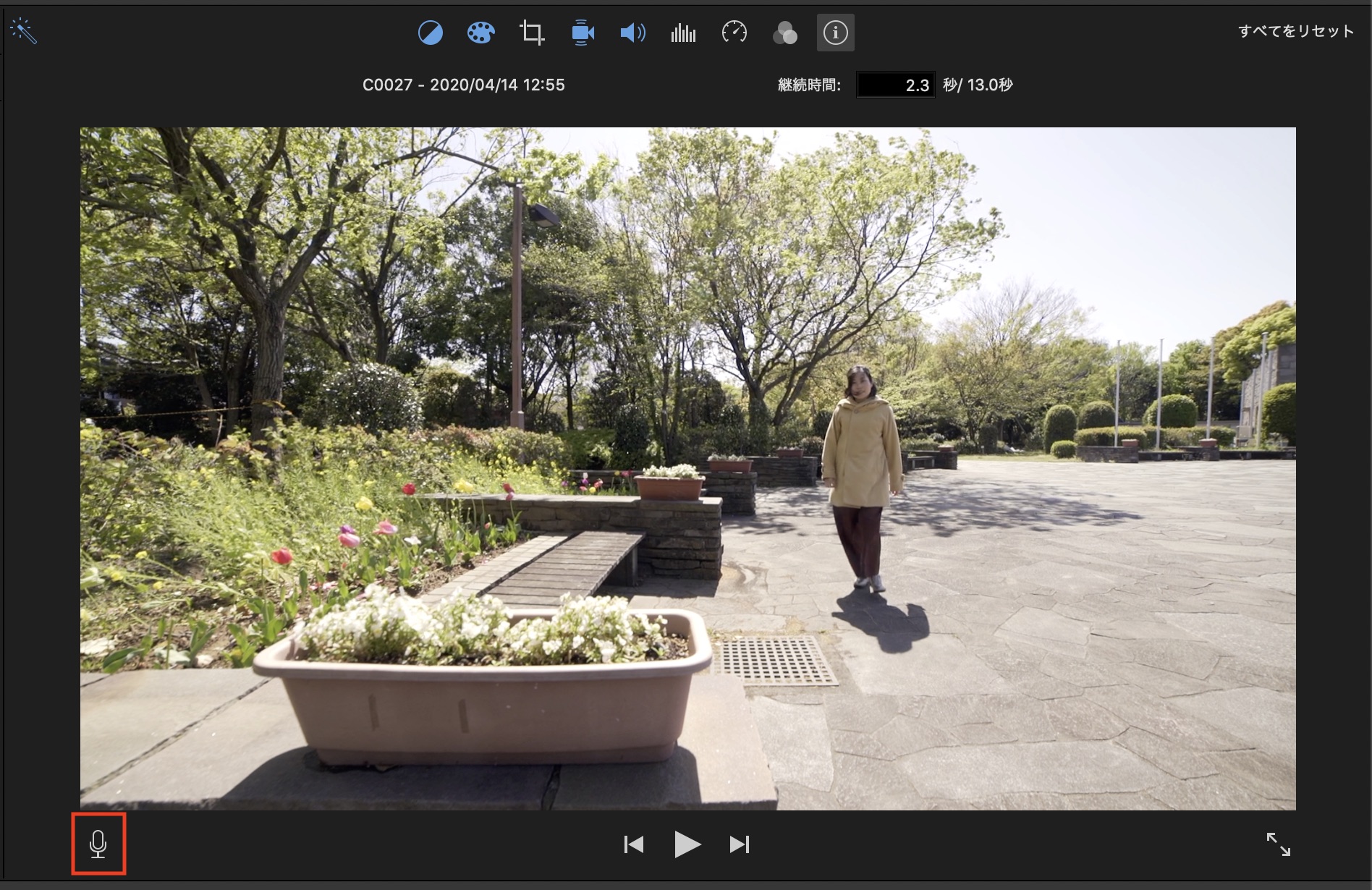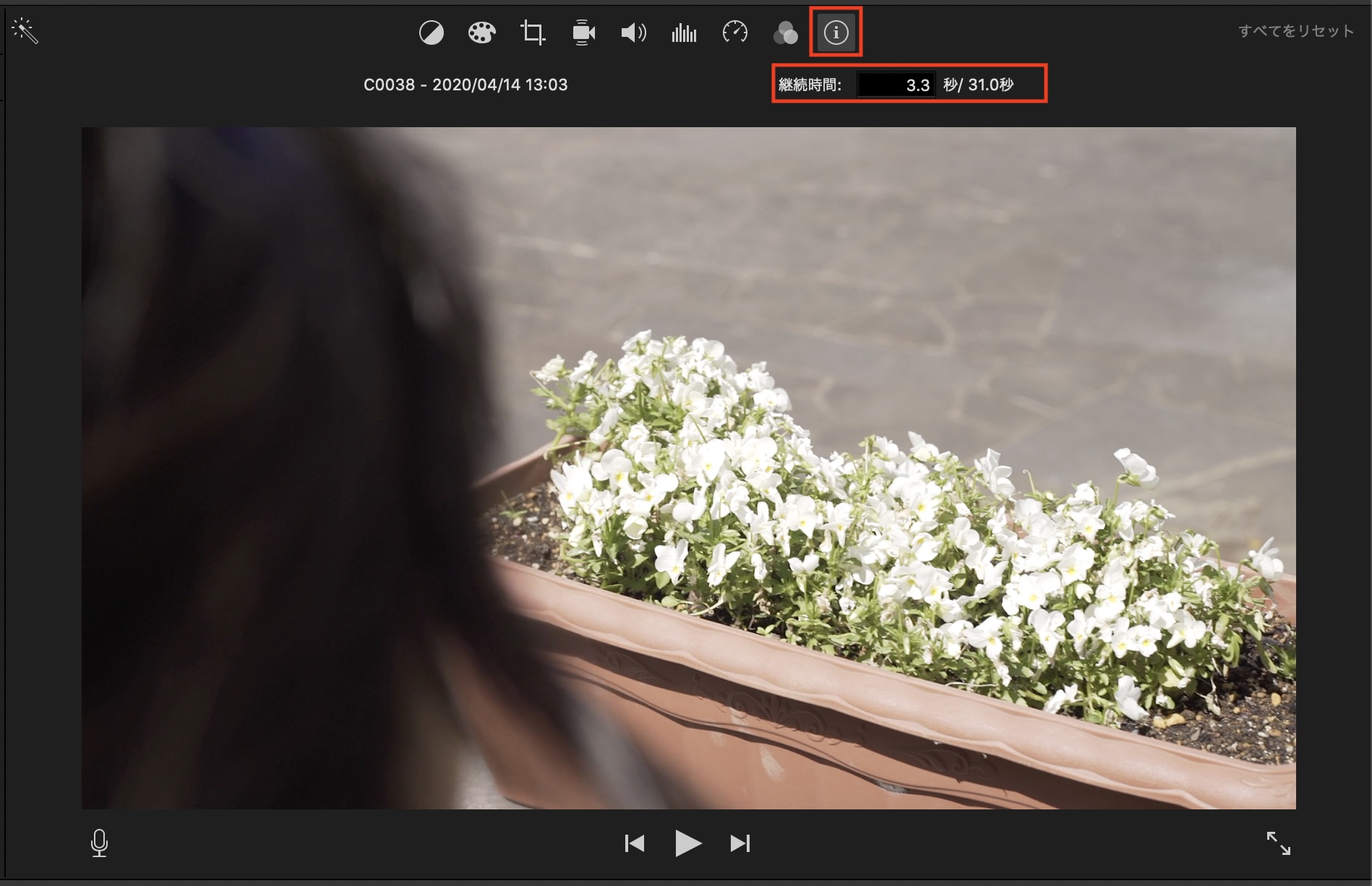 選択中のクリップのファイル名と作成日などを確認できます。他のツールと違って多くは設定できませんが、クリップの継続時間の調整が行なえます。