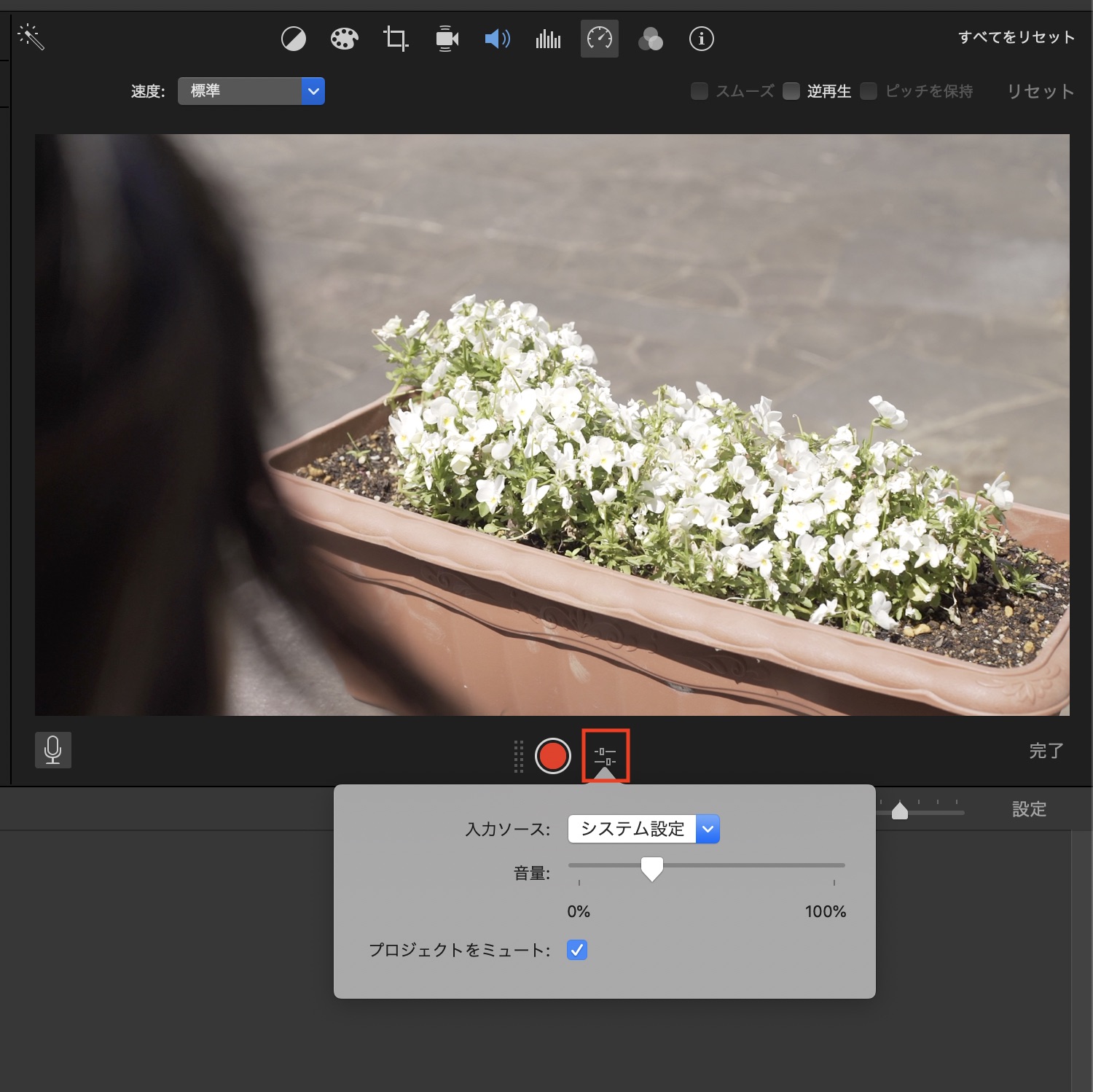 その横にある設定アイコンをクリックすると入力ソースやマイクの音量、そして録音中にプロジェクトの音声をミュートするかのオプションが用意されています。