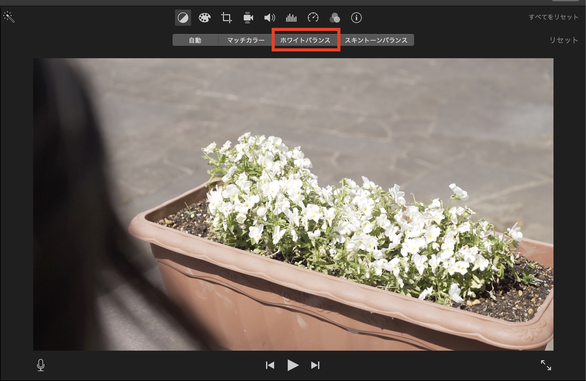 クリップの白色が正しい白色に補正します。「ホワイトバランス」をクリックするとカーソルがスポイトに変化するので、クリップに移っている白色の被写体をクリックするとホワイトバランスが調整されます。