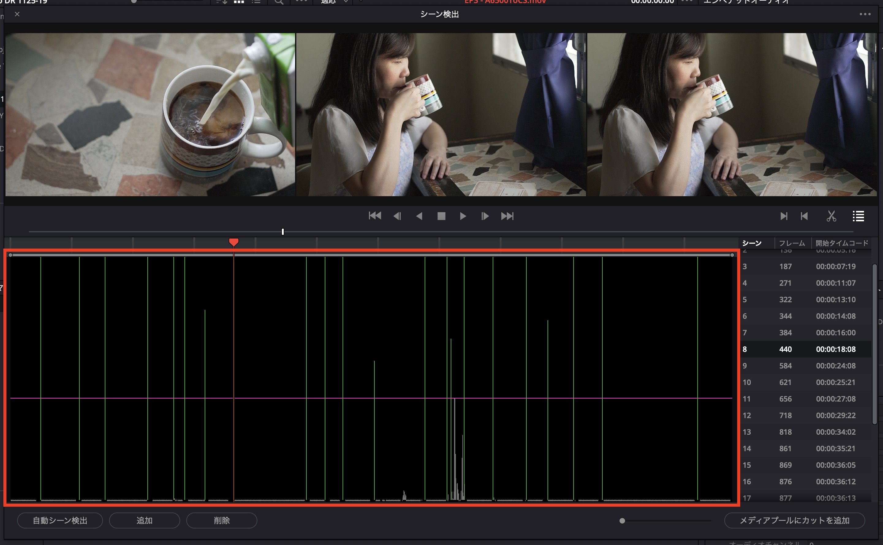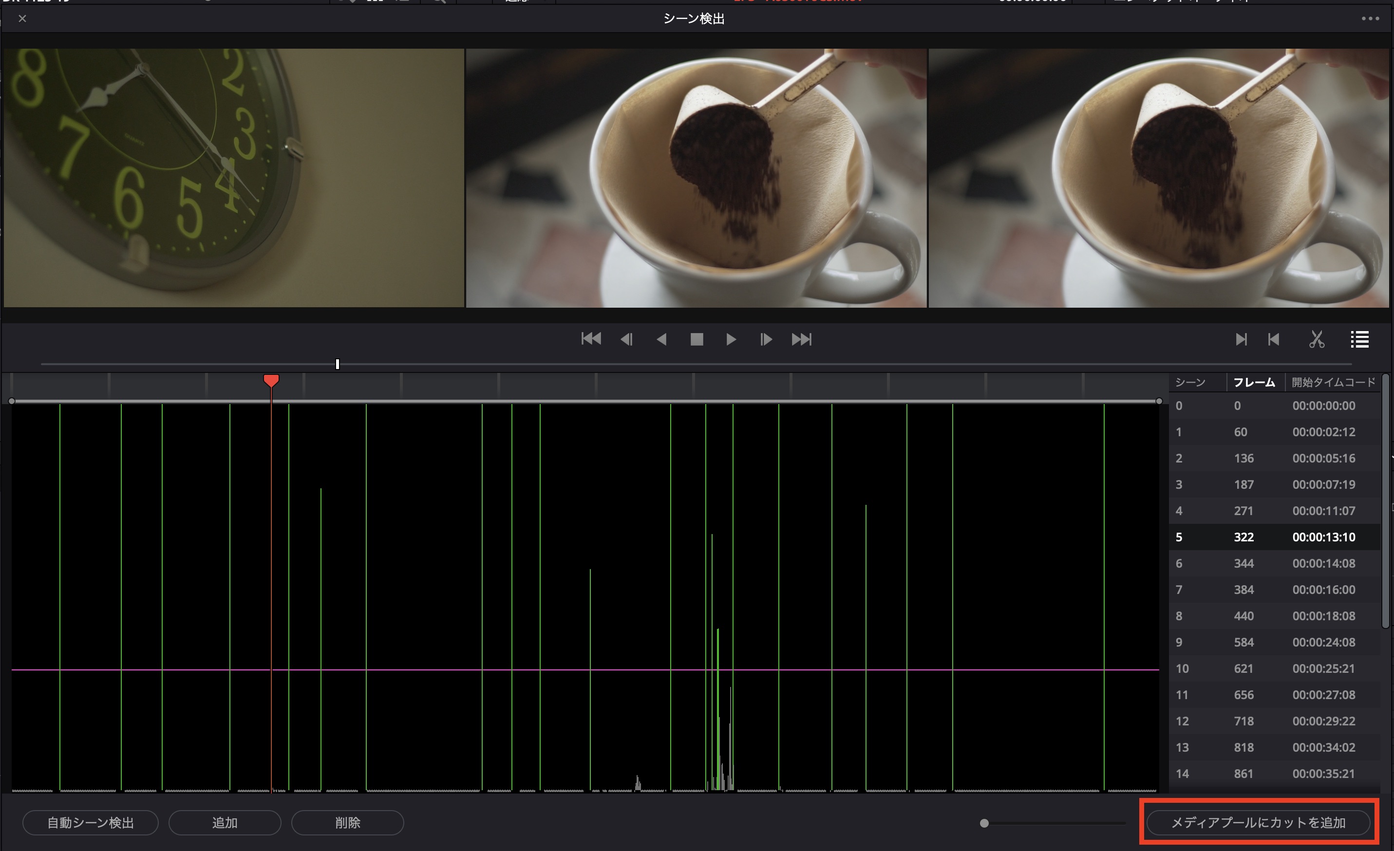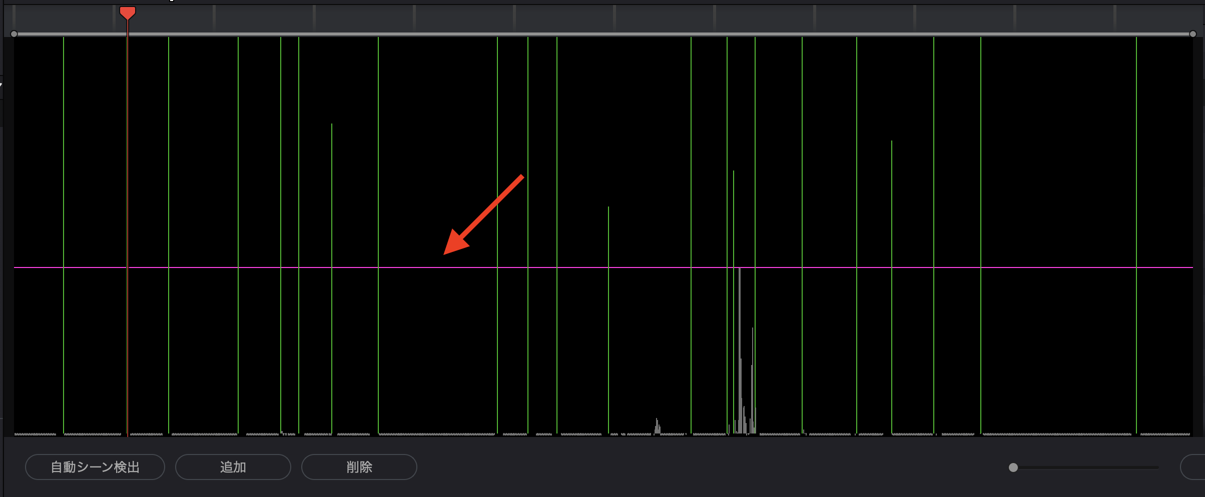 シーンの検出が完了すると、下のように緑色の線と検出されたシーンの一覧がリストとして表示されます。検出後は問題がないか一度確認しておきましょう。