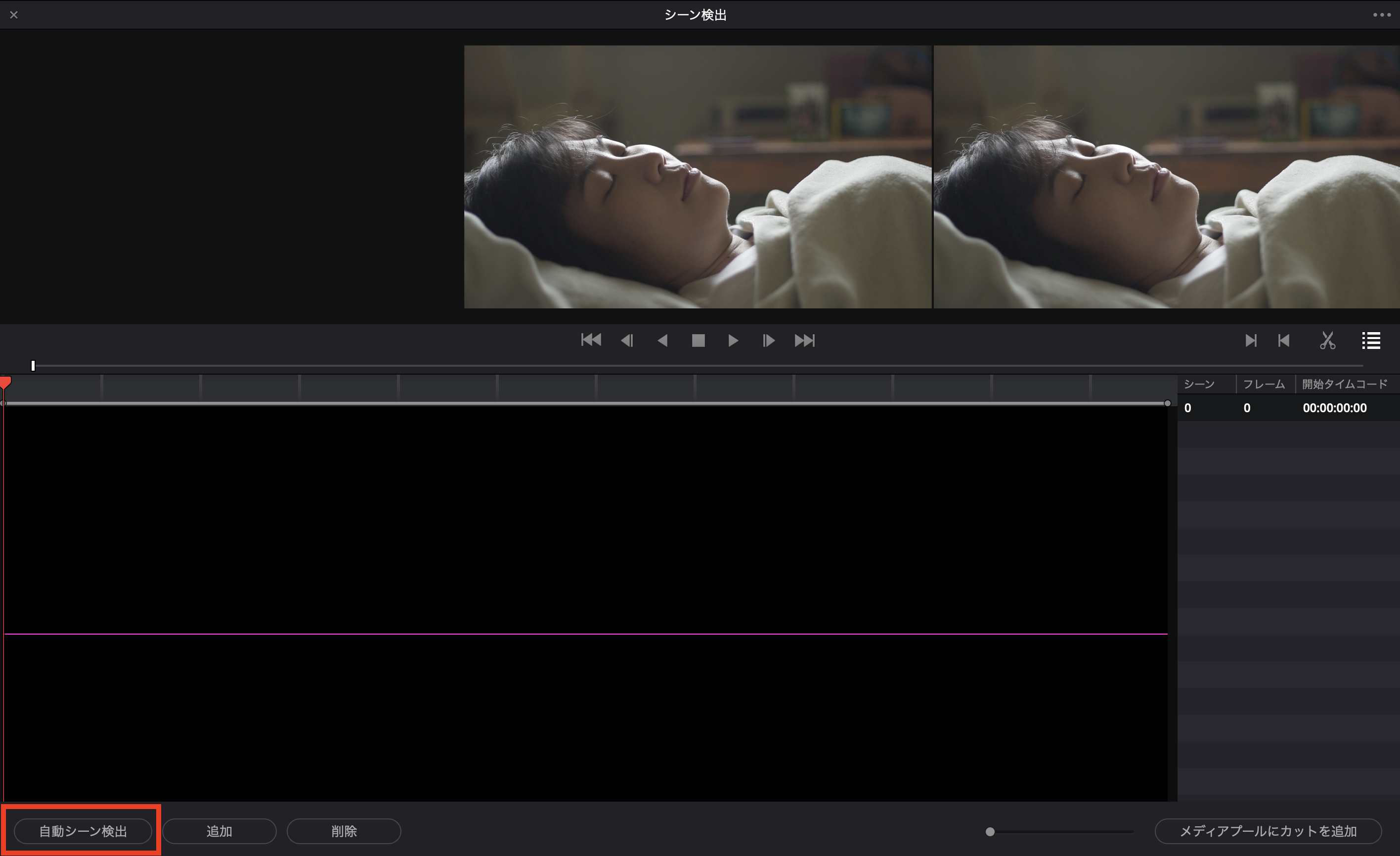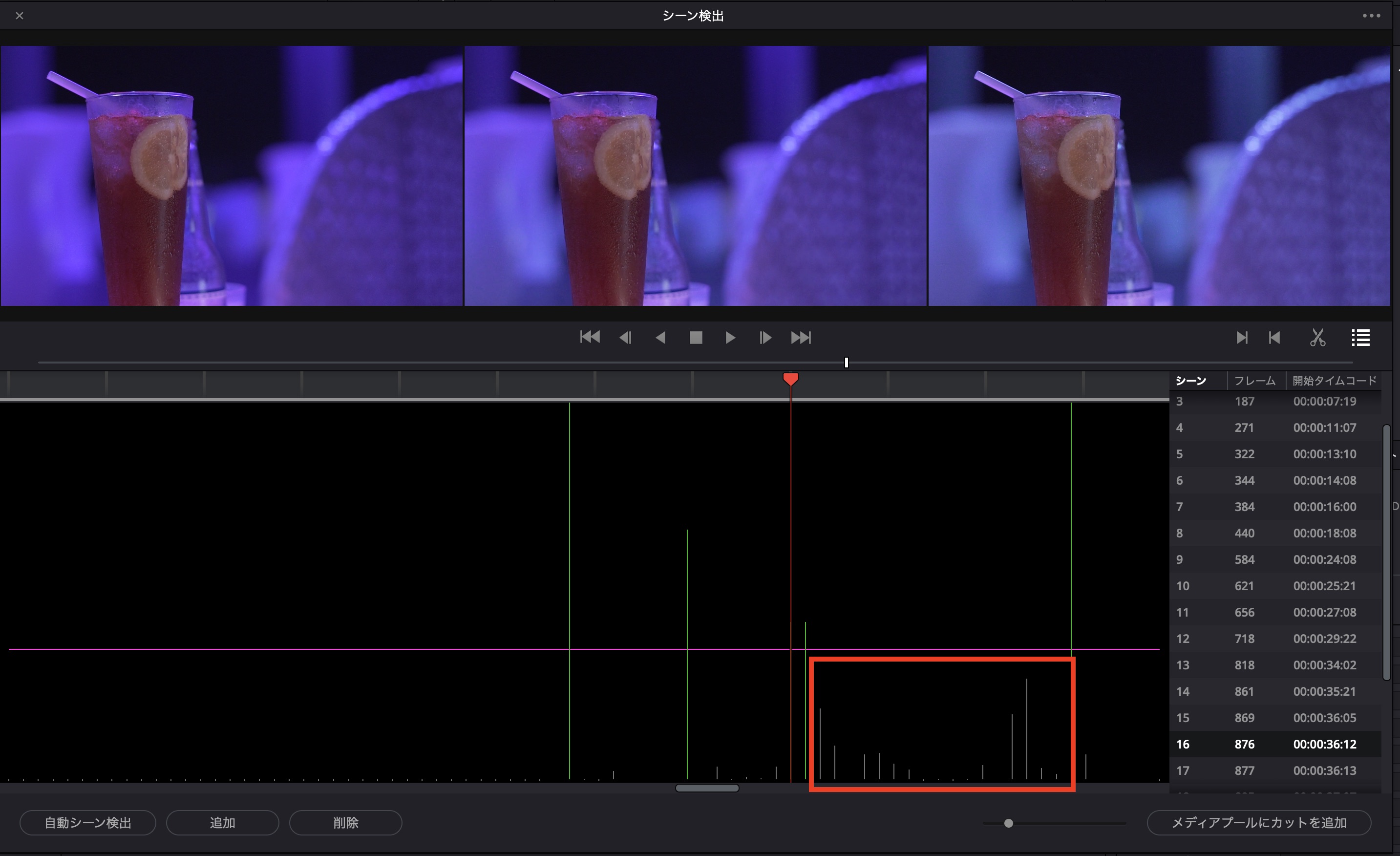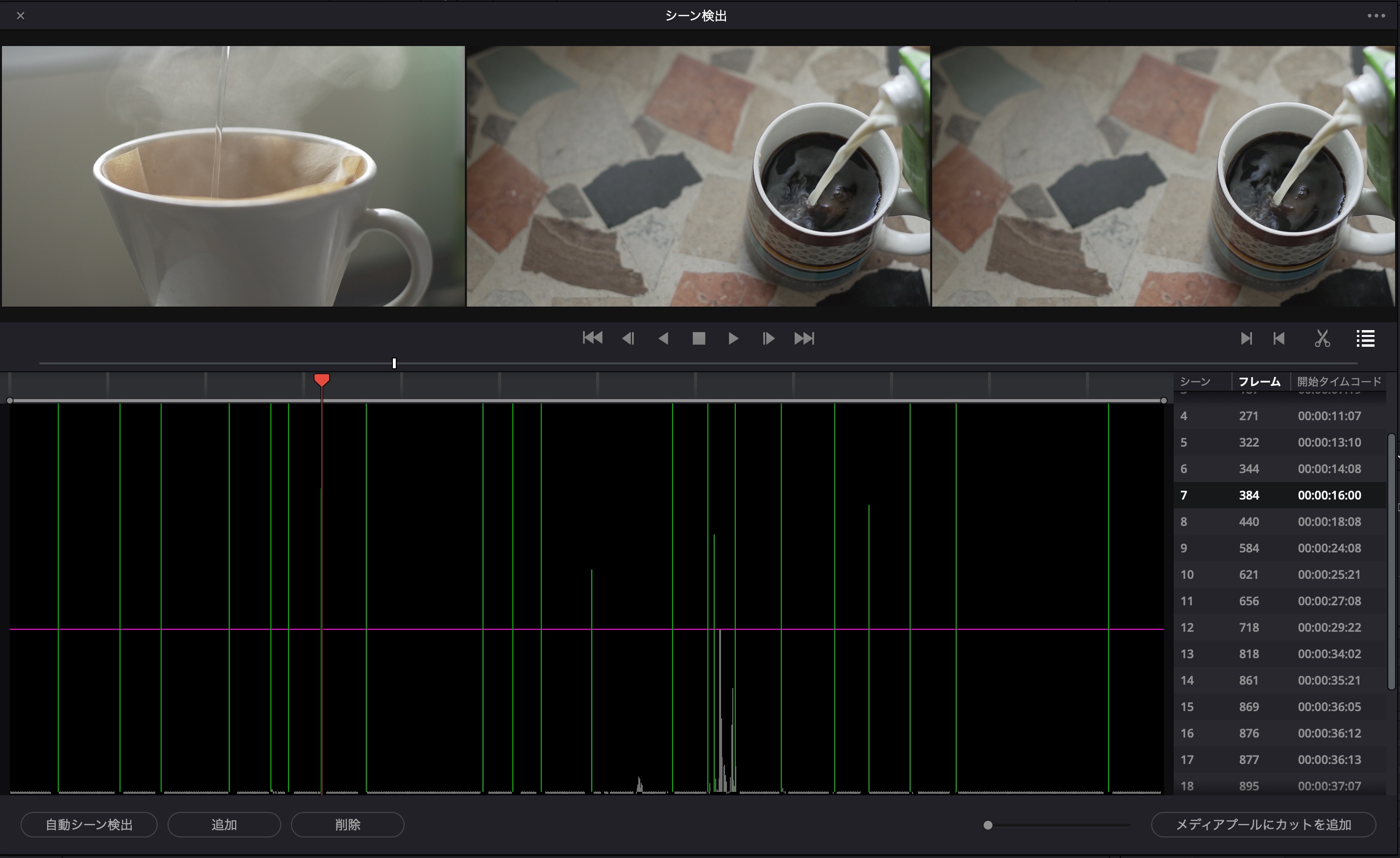 シーンの検出が完了すると、下のように緑色の線と検出されたシーンの一覧がリストとして表示されます。検出後は問題がないか一度確認しておきましょう。