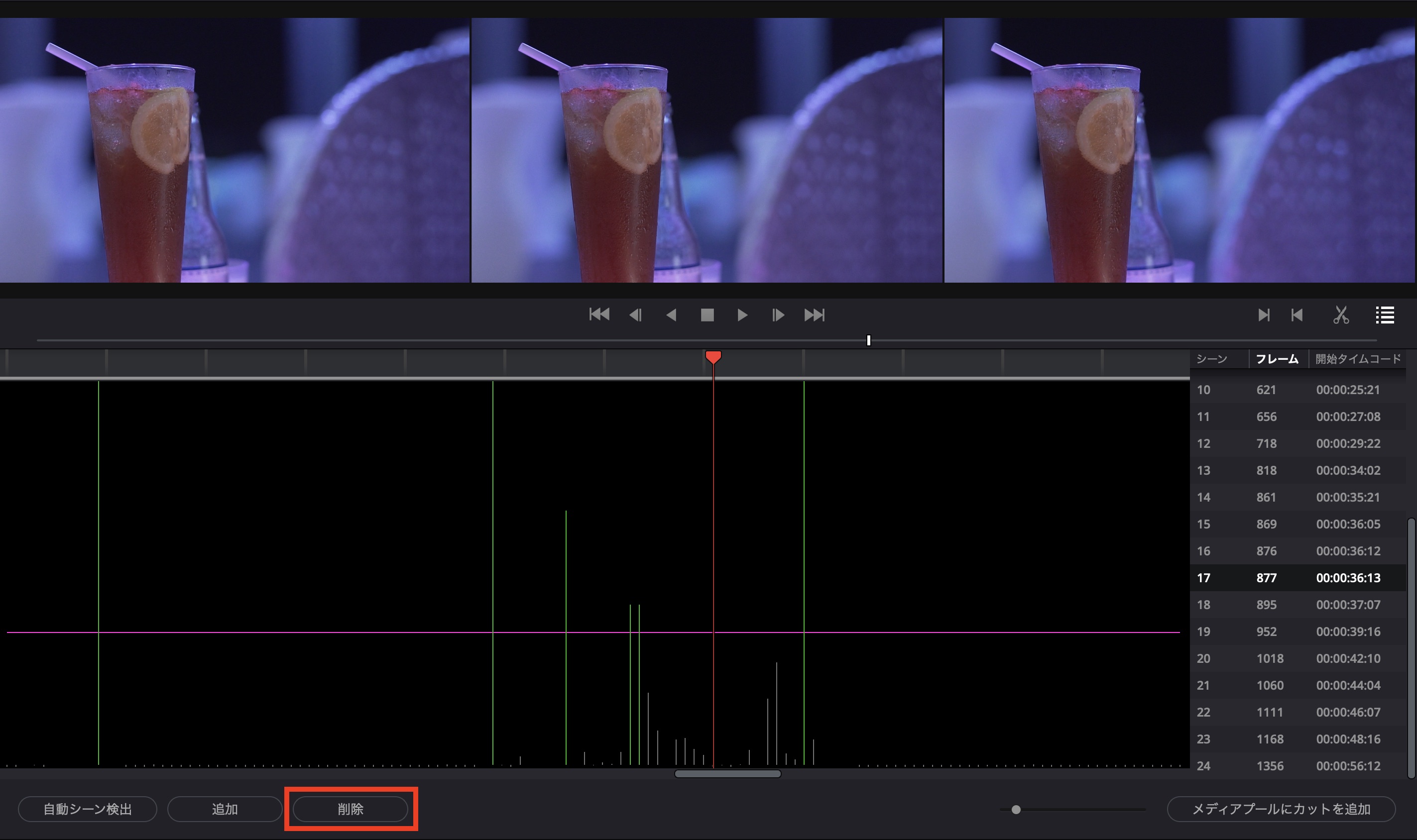 逆にシーンではないが、シーンとして検出された場合は削除したい部分にタイムインディケーターを動かし、「削除」をクリックすれば問題ありません。下の例では照明の関係で認識されていました。