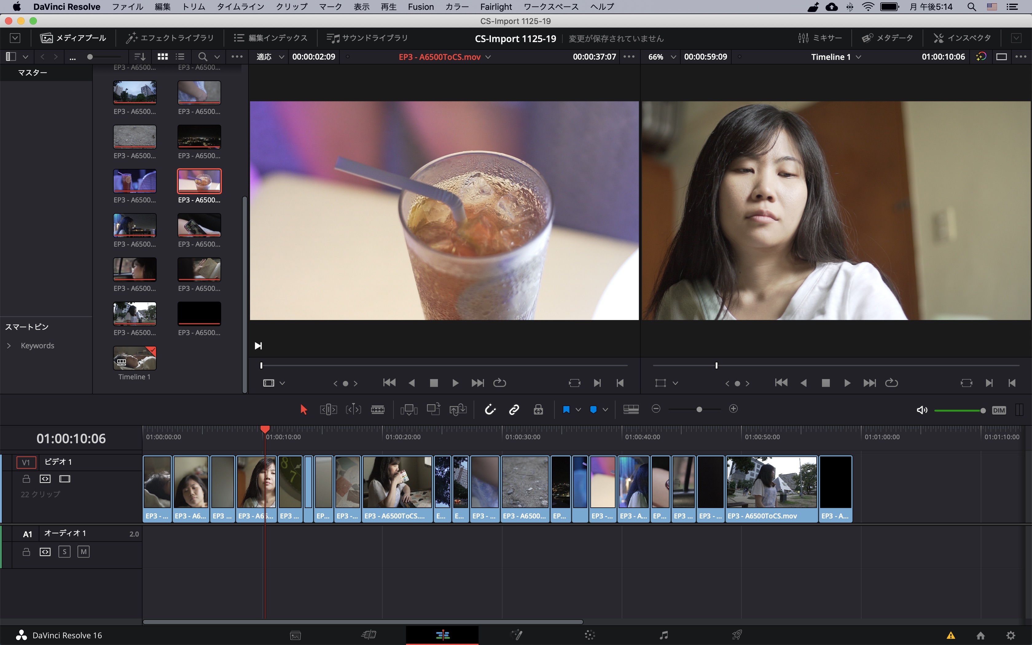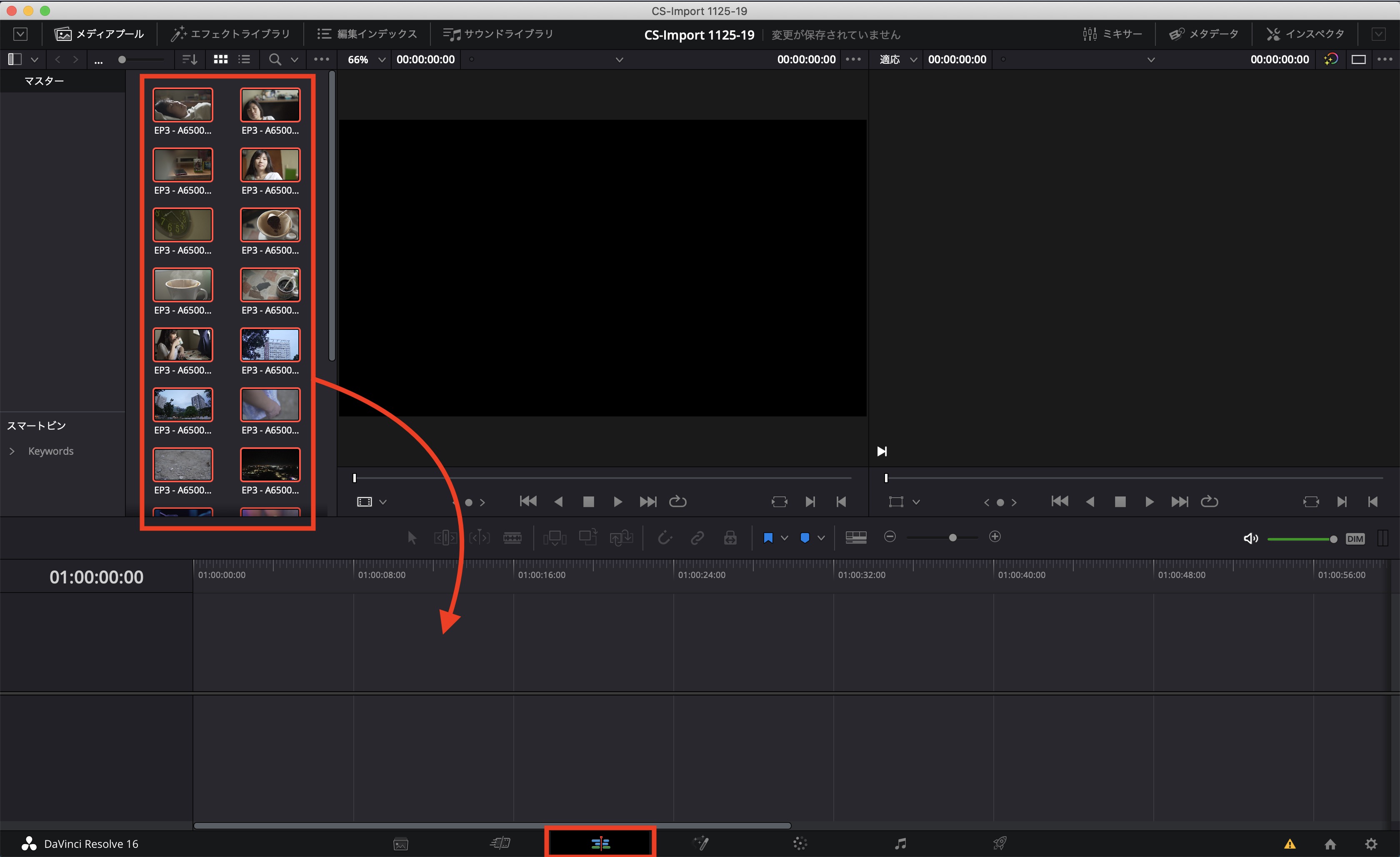 DaVinci Resolveのエディットタブに移動し、メディアプールに表示されているクリップを全て選択、タイムラインにドラッグ・アンド・ドロップした後でカラーページから色補正やグレーディングを行うことが出来るようになります。