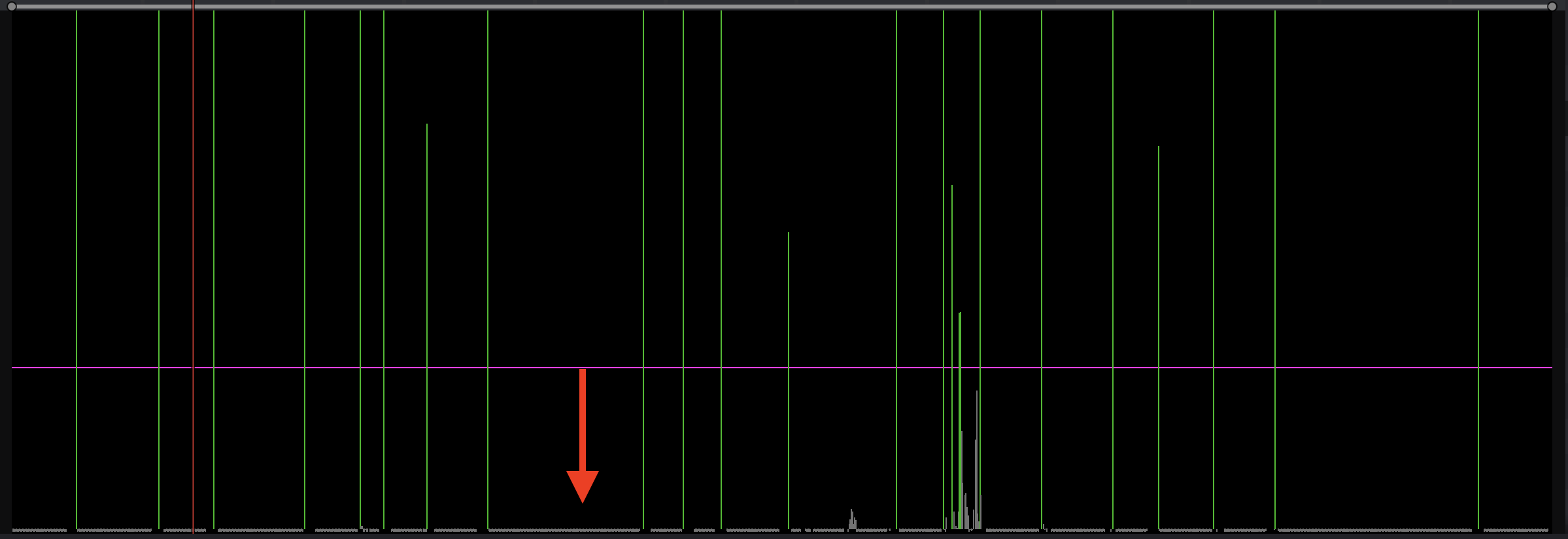 下に表示されている緑色の線は紫色の「しきい値」を元に可能性のあるカット(シーン)を解析しています。しきい値が高ければ検出に失敗する可能性があるので、半分より下に設定することをオススメします。