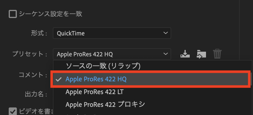 高画質にするのが理想なので、macOSを使っている方は「形式」を「QuickTime」に、プリセットを「Apple ProRes 422 HQ」または「ProRes 4444」にすることをオススメします。
