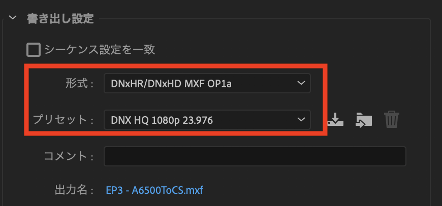 Windows環境でProRes形式で書き出せない方は形式を「DNxHR/DNxHD MXF OP1a」を選択して、プロジェクトにマッチしたフレームレートのプリセットを選びましょう。