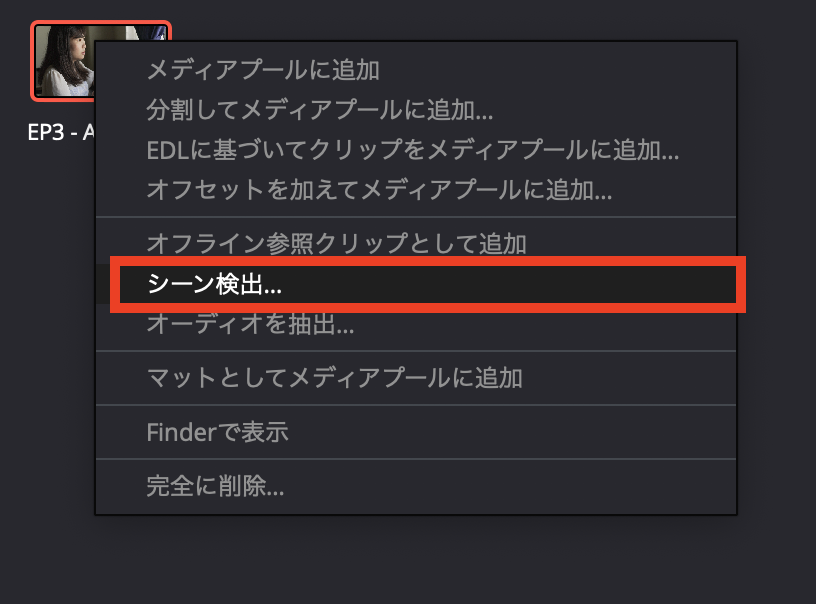 読み込むクリップを右クリック、「シーン検出」をクリックしましょう。
